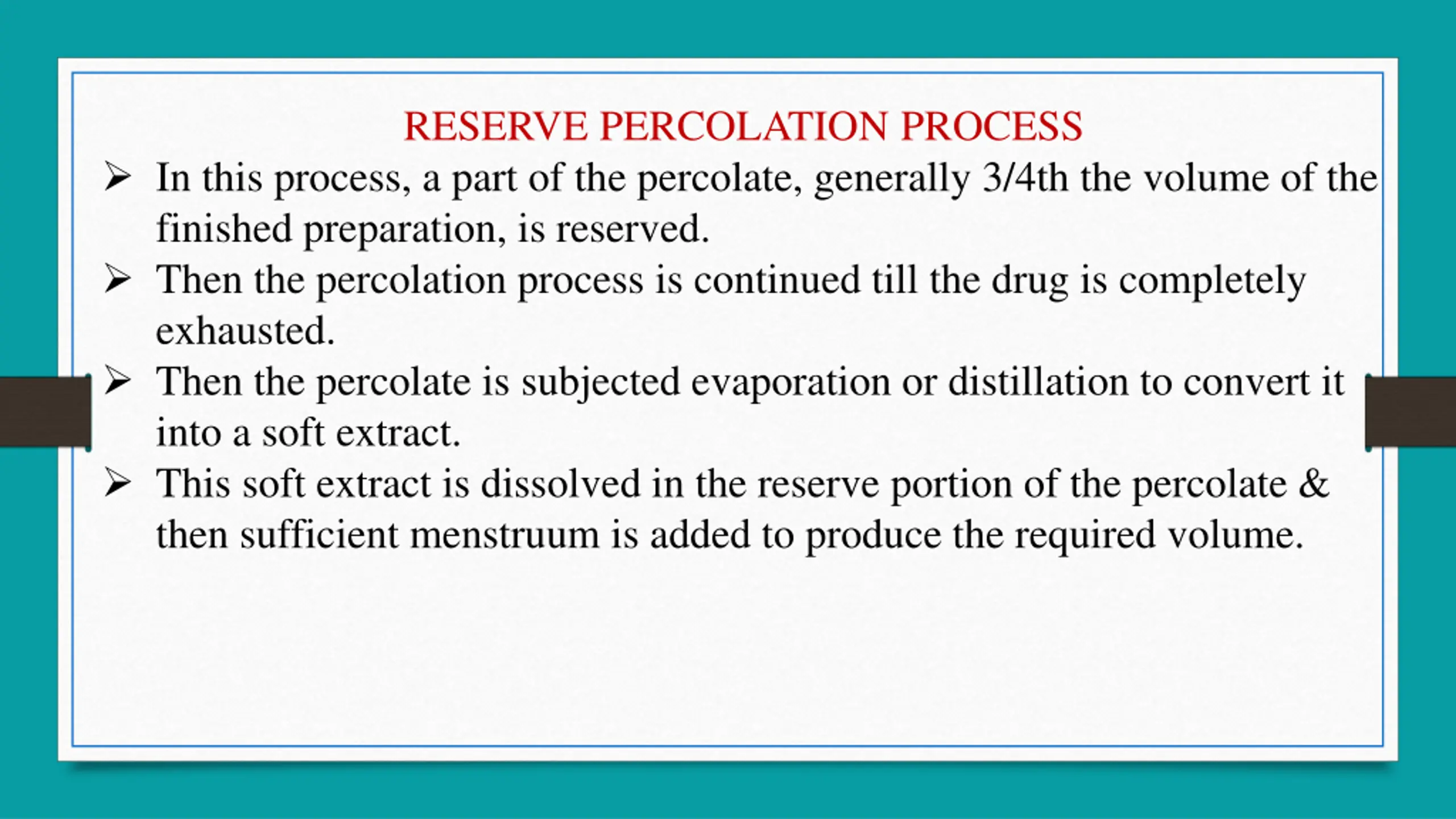 RESERVE PERCOLATION PROCESS In this process, a part of the percolate, generally 3/4th the volume of the finished preparation, is reserved. Then the percolation process is continued till the drug is completely exhausted. Then the percolate is subjected evaporation or distillation to convert it into a soft extract. This soft extract is dissolved in the reserve portion of the percolate & then sufficient menstruum is added to produce the required volume.