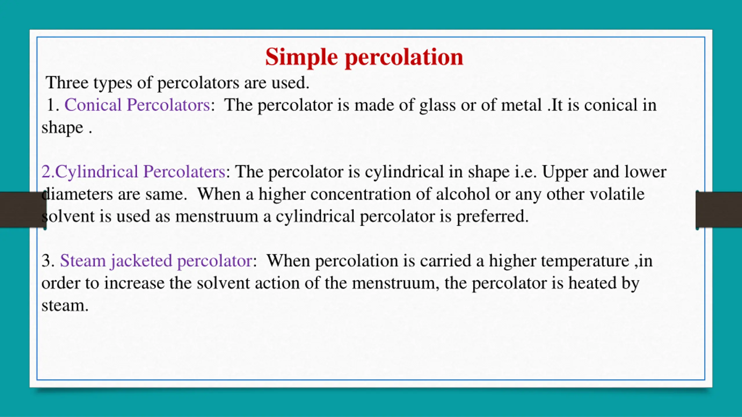 Simple percolation Three types of percolators are used. 1. Conical Percolators: The percolator is made of glass or of metal .It is conical in shape . 2.Cylindrical Percolaters: The percolator is cylindrical in shape i.e. Upper and lower diameters are same. When a higher concentration of alcohol or any other volatile solvent is used as menstruum a cylindrical percolator is preferred. 3. Steam jacketed percolator: When percolation is carried a higher temperature ,in order to increase the solvent action of the menstruum, the percolator is heated by steam.