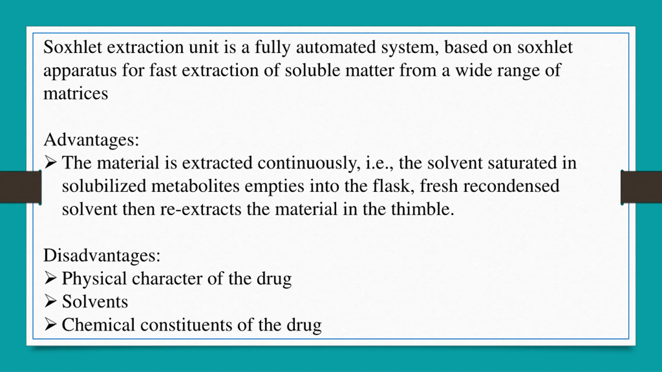 Soxhlet extraction unit is a fully automated system, based on soxhlet apparatus for fast extraction of soluble matter from a wide range of matrices Advantages: The material is extracted continuously, i.e., the solvent saturated in solubilized metabolites empties into the flask, fresh recondensed solvent then re-extracts the material in the thimble. Disadvantages: Physical character of the drug Solvents Chemical constituents of the drug