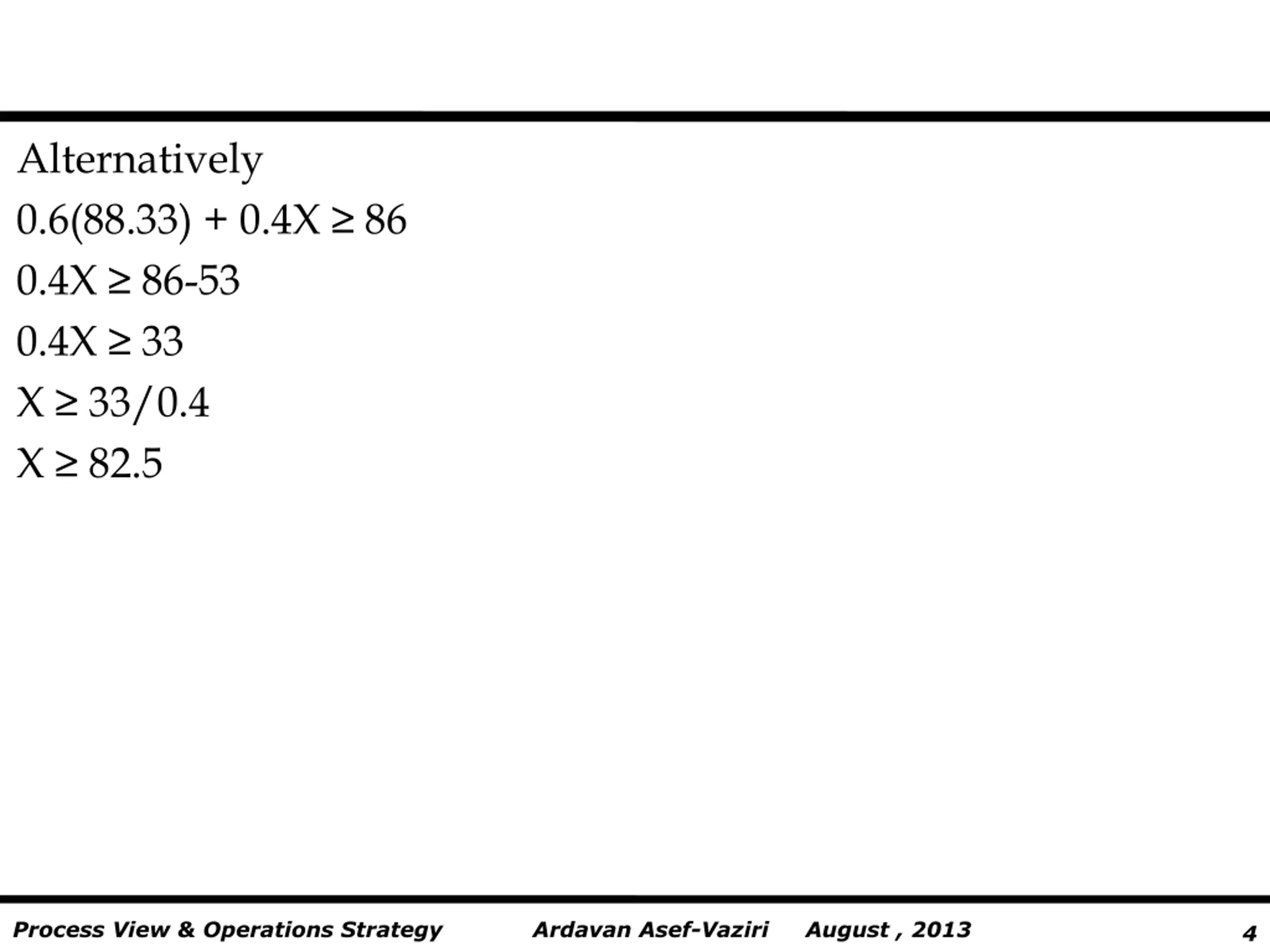 Alternatively 0.6(88.33) + 0.4X 86 0.4X 86-53 0.4X 33 X 33/0.4 X 82.5 Process View & Operations Strategy Ardavan Asef-Vaziri August , 2013 4