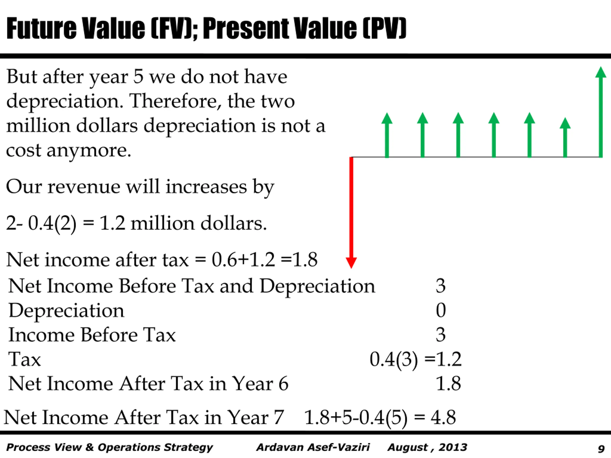 Future Value (FV); Present Value (PV) But after year 5 we do not have depreciation. Therefore, the two million dollars depreciation is not a cost anymore. Our revenue will increases by 2- 0.4(2) = 1.2 million dollars. Net income after tax = 0.6+1.2 =1.8 Net Income Before Tax and Depreciation Depreciation Income Before Tax Tax Net Income After Tax in Year 6 Net Income After Tax in Year 7 1.8+5-0.4(5) = 4.8 3 0 3 0.4(3) =1.2 1.8 Process View & Operations Strategy Ardavan Asef-Vaziri August , 2013 9