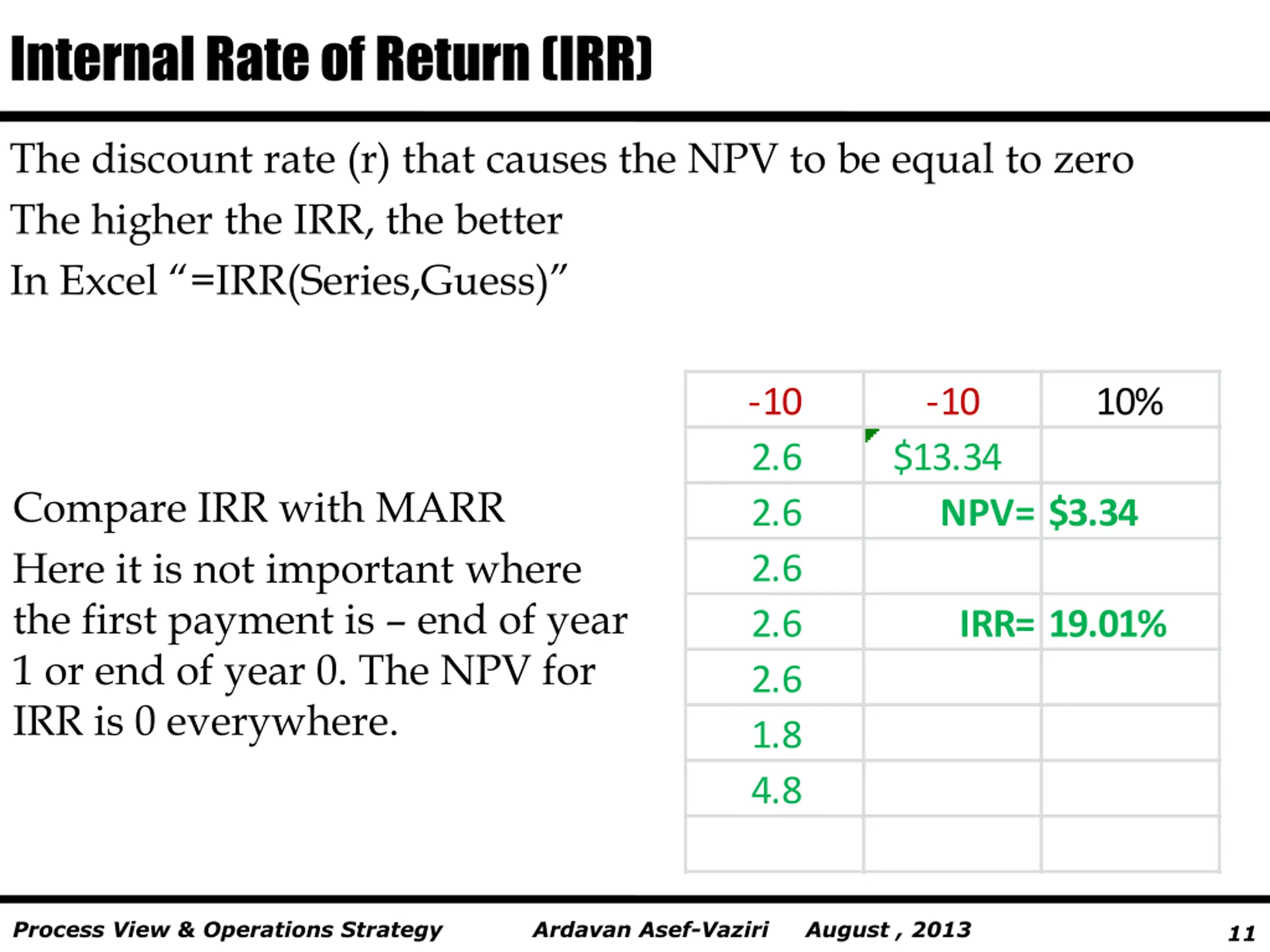Internal Rate of Return (IRR) The discount rate (r) that causes the NPV to be equal to zero The higher the IRR, the better In Excel =IRR(Series,Guess) -10 2.6 2.6 2.6 2.6 2.6 1.8 4.8 -10 10% $13.34 NPV= $3.34 Compare IRR with MARR Here it is not important where the first payment is end of year 1 or end of year 0. The NPV for IRR is 0 everywhere. IRR= 19.01% Process View & Operations Strategy Ardavan Asef-Vaziri August , 2013 11
