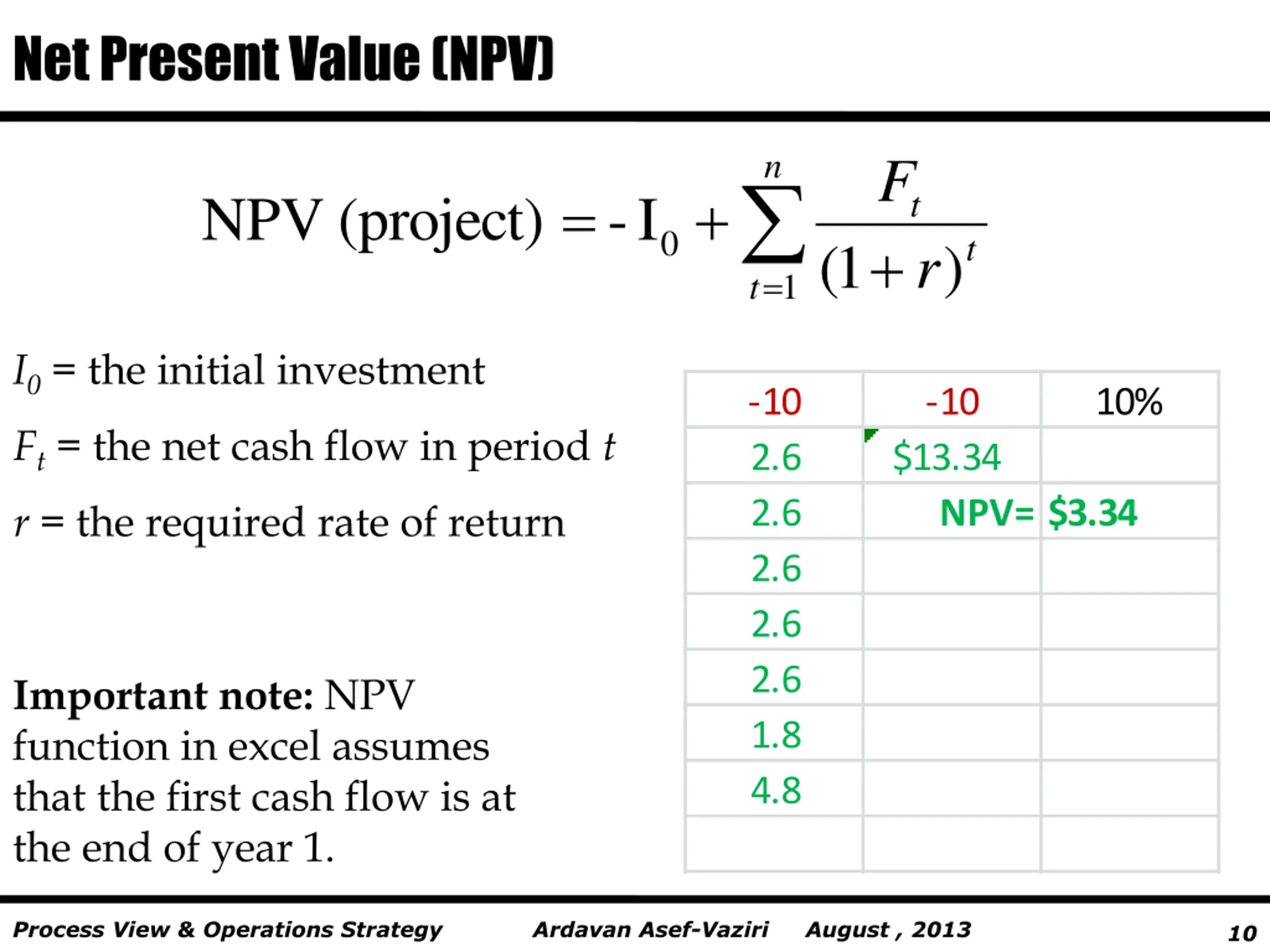 Net Present Value (NPV) n F = t = + NPV (project) I - t 0 + t 1 ( ) r 1 I0= the initial investment Ft= the net cash flow in period t r = the required rate of return -10 2.6 2.6 2.6 2.6 2.6 1.8 4.8 -10 10% $13.34 NPV= $3.34 Important note: NPV function in excel assumes that the first cash flow is at the end of year 1. Process View & Operations Strategy Ardavan Asef-Vaziri August , 2013 10