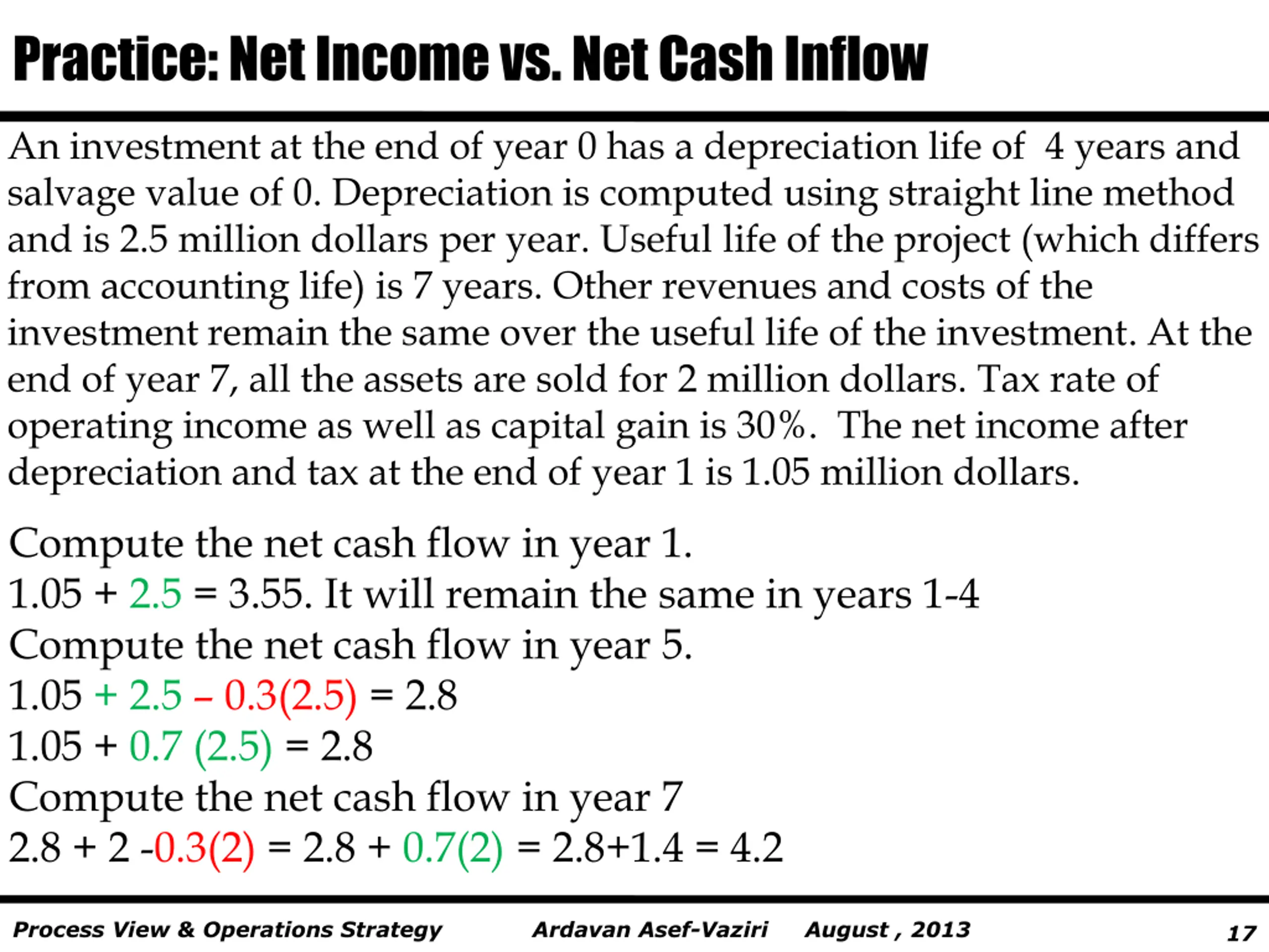 Practice: Net Income vs. Net Cash Inflow What is the net cash flow of the project during its useful life. Compute NPV under 10% MARR and IRR. Rate= 0.1 Year Net Cash Flow 0 -10 1 3.55 2 3.55 3 3.55 4 3.55 5 2.8 6 2.8 7 4.2 Year 0 Years 1-7 NPV= IRR= -10.0 16.7 6.7 29% Process View & Operations Strategy Ardavan Asef-Vaziri August , 2013 16
