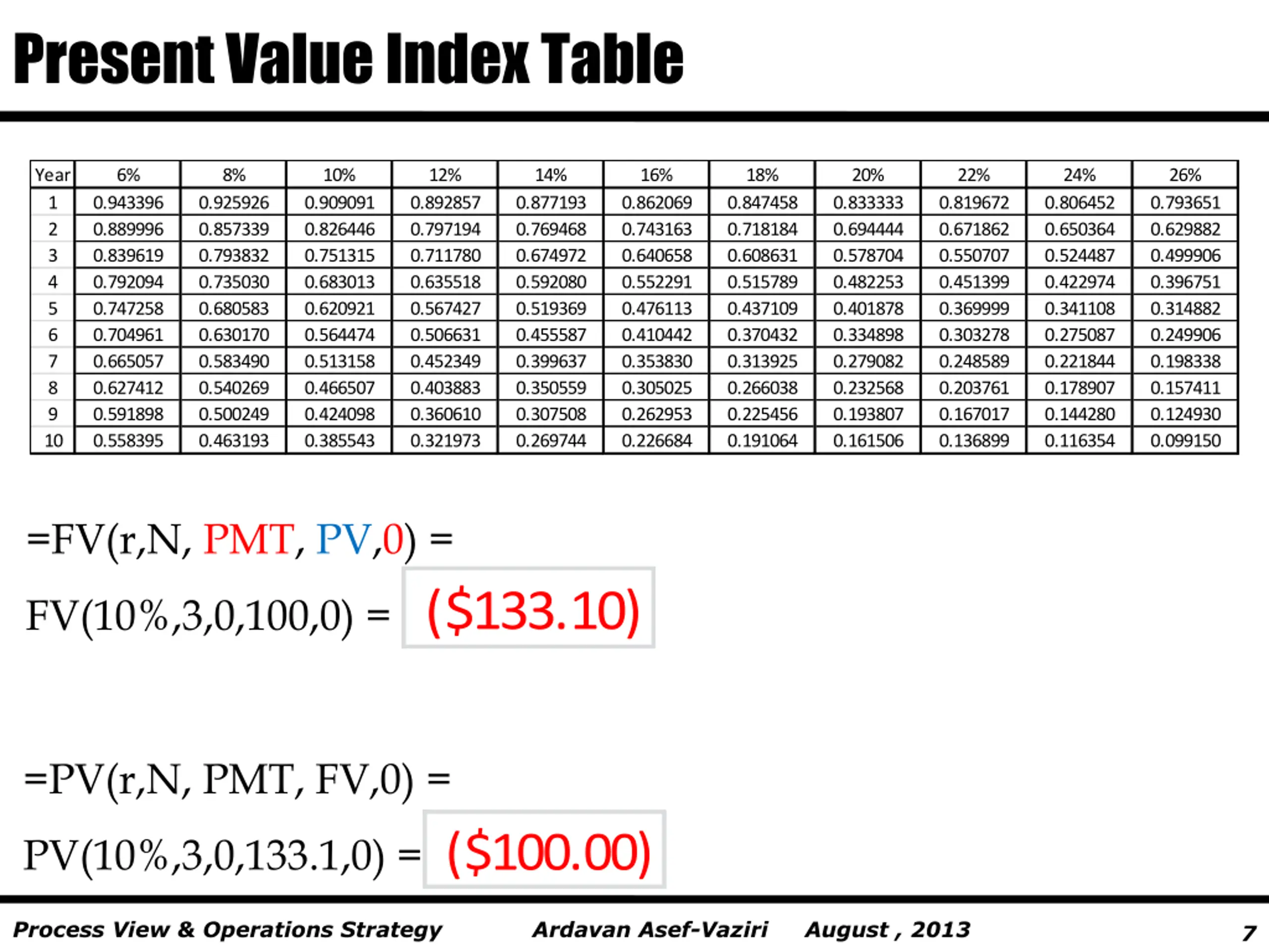 Future Value (FV); Present Value (PV) P: The initial vale MARR: Minimum Acceptable Rate of Return F= P(1+MARR)N P = F/(1+MARR)N P = F/(1+r)N r = the minimum acceptable rate of return =FV(r, N,PMT,PV,0 EOY) = =PV(r, N,PMT,FV,0 EOY) = Process View & Operations Strategy Ardavan Asef-Vaziri August , 2013 6