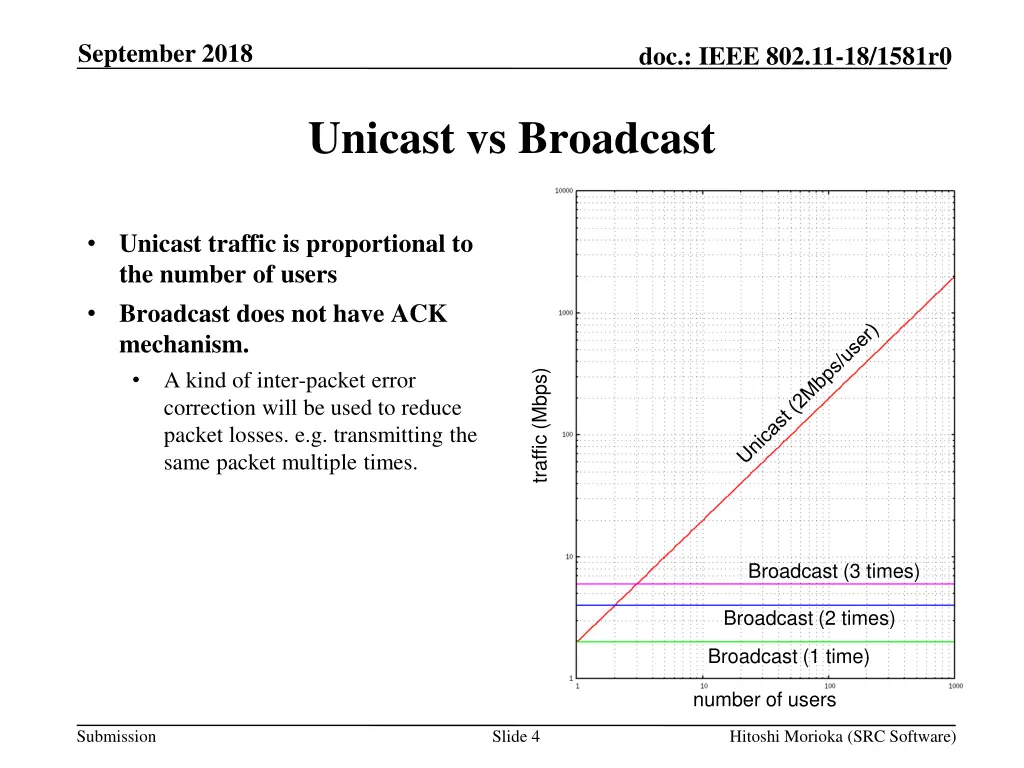 September 2018 doc.: IEEE 802.11-18/1581r0 Unicast vs Broadcast Unicast traffic is proportional to the number of users Broadcast does not have ACK mechanism. A kind of inter-packet error correction will be used to reduce packet losses. e.g. transmitting the same packet multiple times. traffic (Mbps) Broadcast (3 times) Broadcast (2 times) Broadcast (1 time) number of users Submission Slide 4 Hitoshi Morioka (SRC Software)