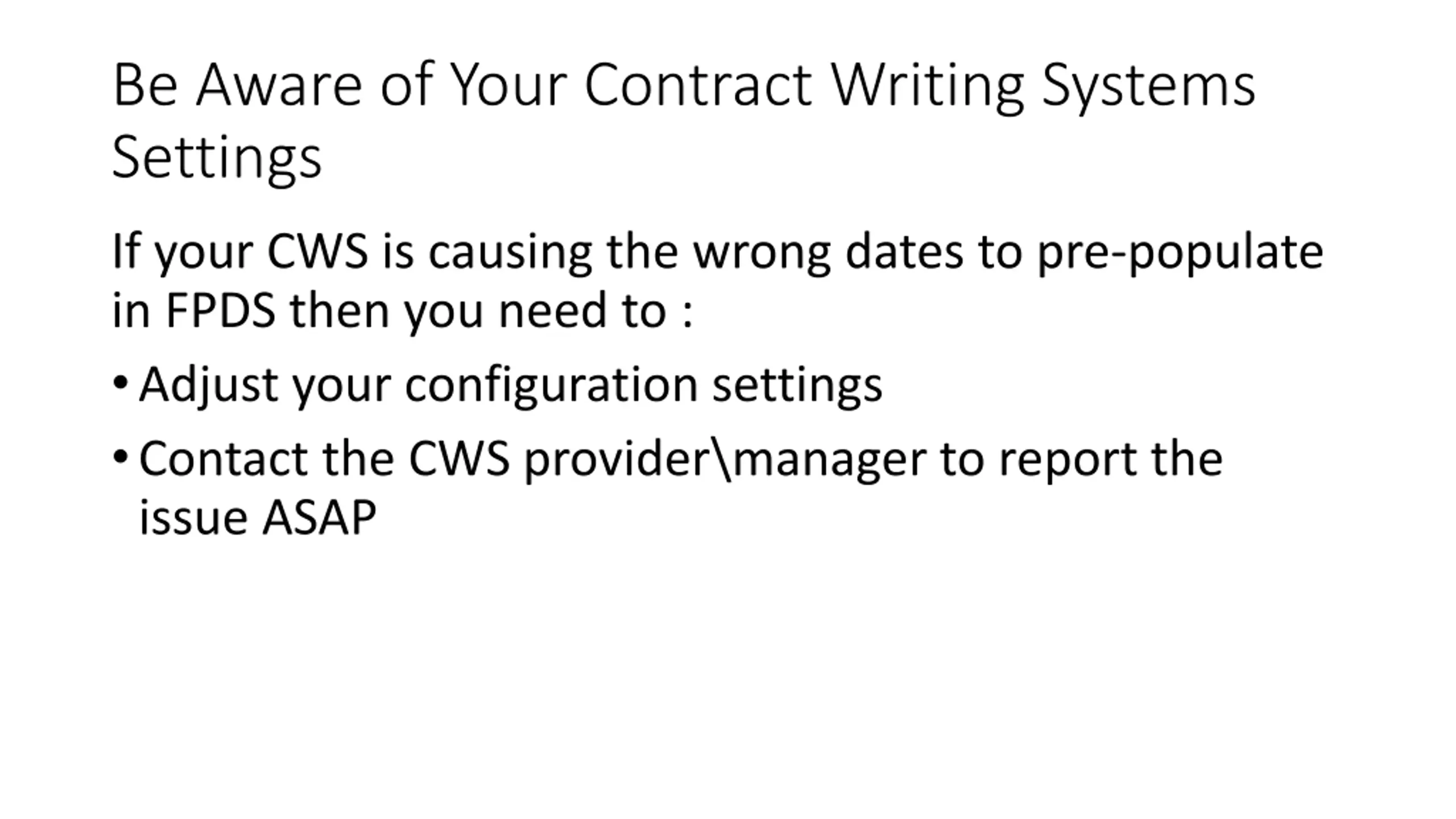 Be Aware of Your Contract Writing Systems Settings If your CWS is causing the wrong dates to pre-populate in FPDS then you need to : Adjust your configuration settings Contact the CWS provider\manager to report the issue ASAP