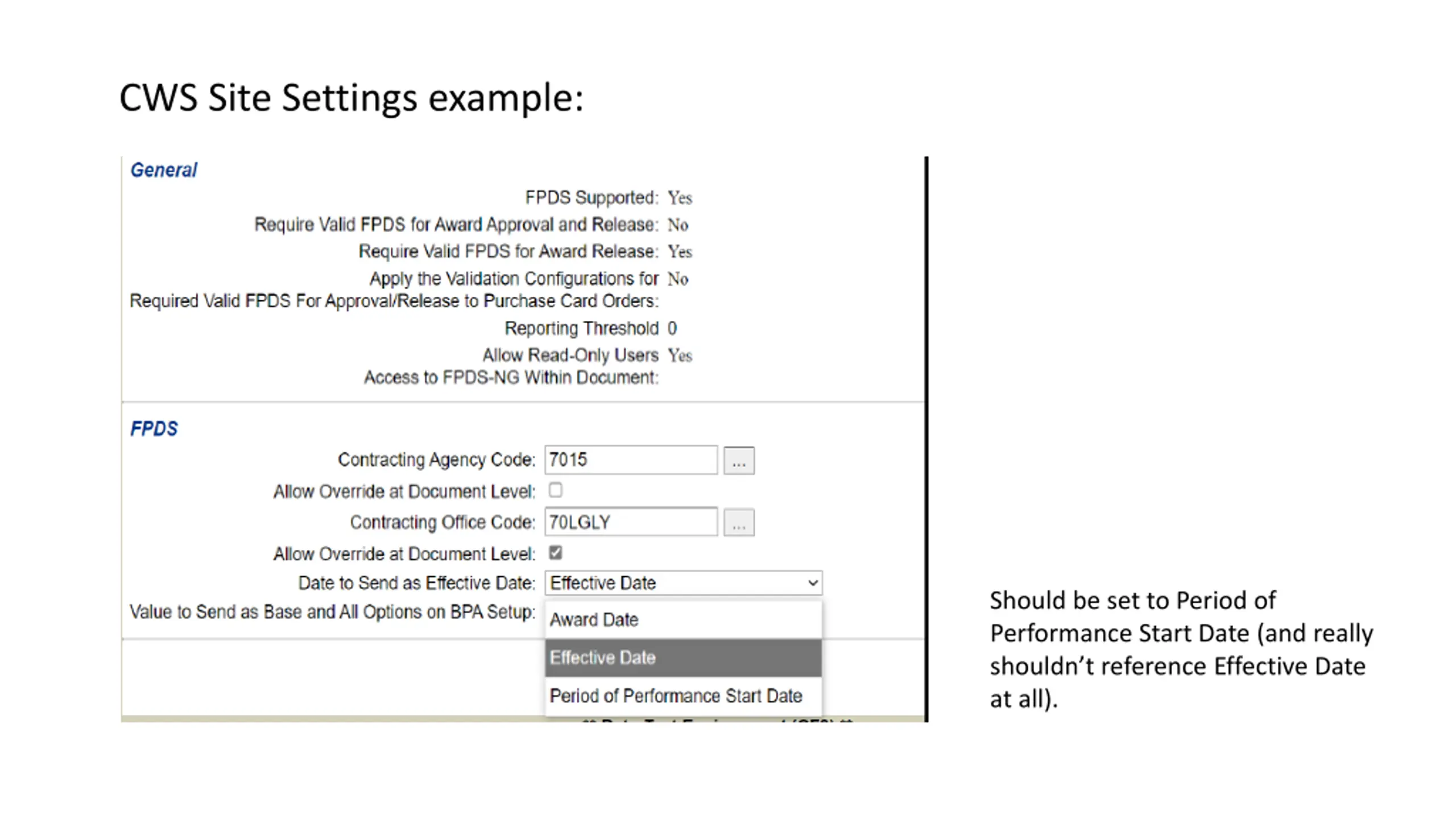 CWS Site Settings example: Should be set to Period of Performance Start Date (and really shouldn t reference Effective Date at all).