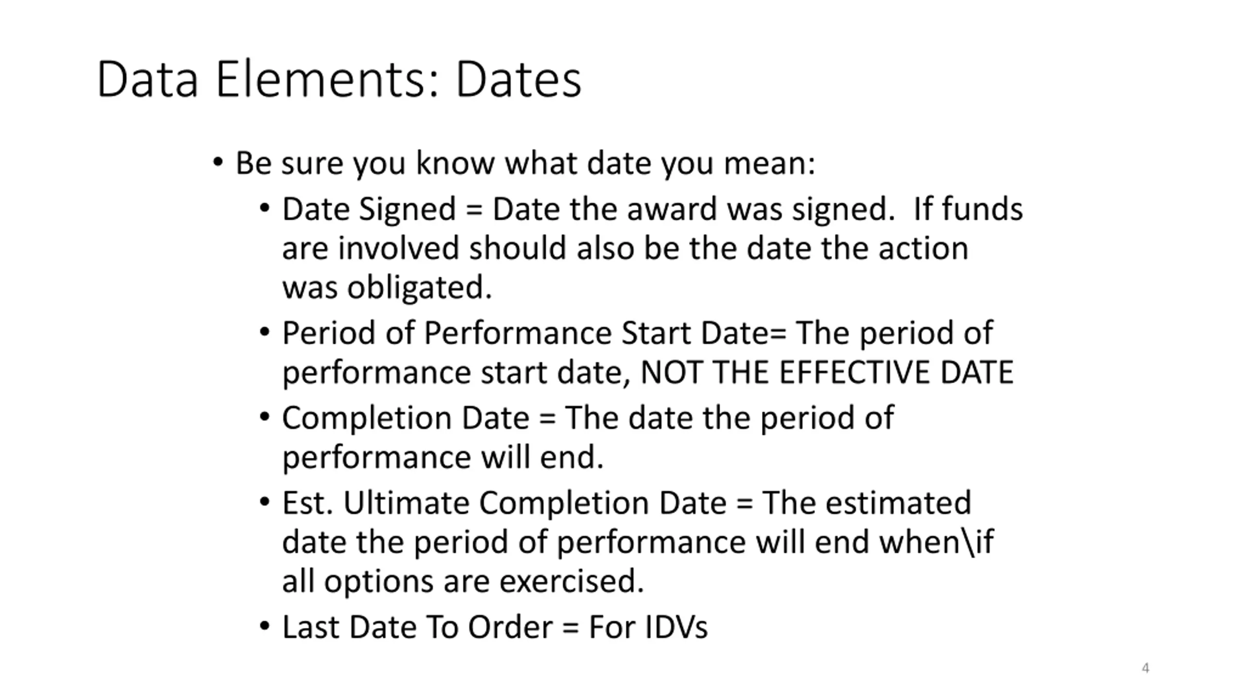 Data Elements: Dates Be sure you know what date you mean: Date Signed = Date the award was signed. If funds are involved should also be the date the action was obligated. Period of Performance Start Date= The period of performance start date, NOT THE EFFECTIVE DATE Completion Date = The date the period of performance will end. Est. Ultimate Completion Date = The estimated date the period of performance will end when\if all options are exercised. Last Date To Order = For IDVs 4