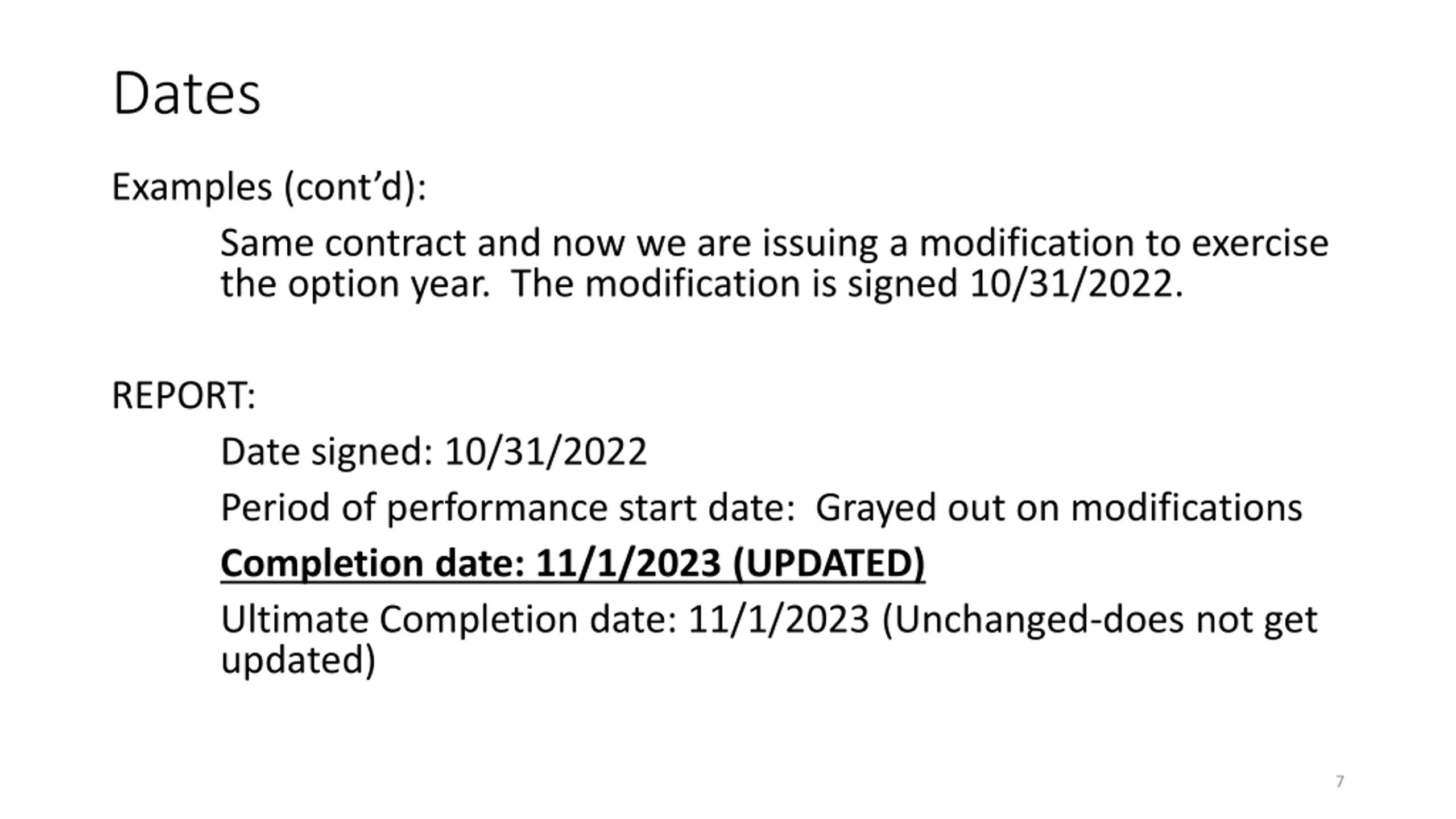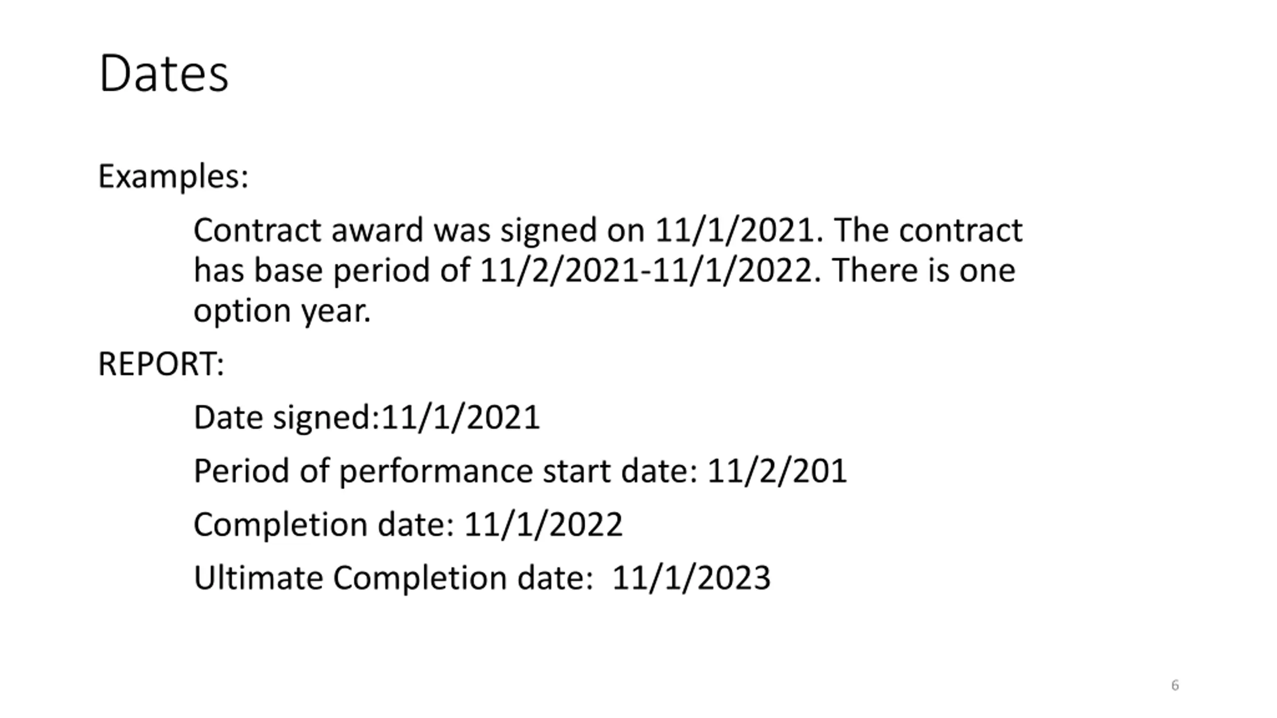 Dates Examples: REPORT: Contract award was signed on 11/1/2021. The contract has base period of 11/2/2021-11/1/2022. There is one option year. Date signed:11/1/2021 Period of performance start date: 11/2/201 Completion date: 11/1/2022 Ultimate Completion date: 11/1/2023 6