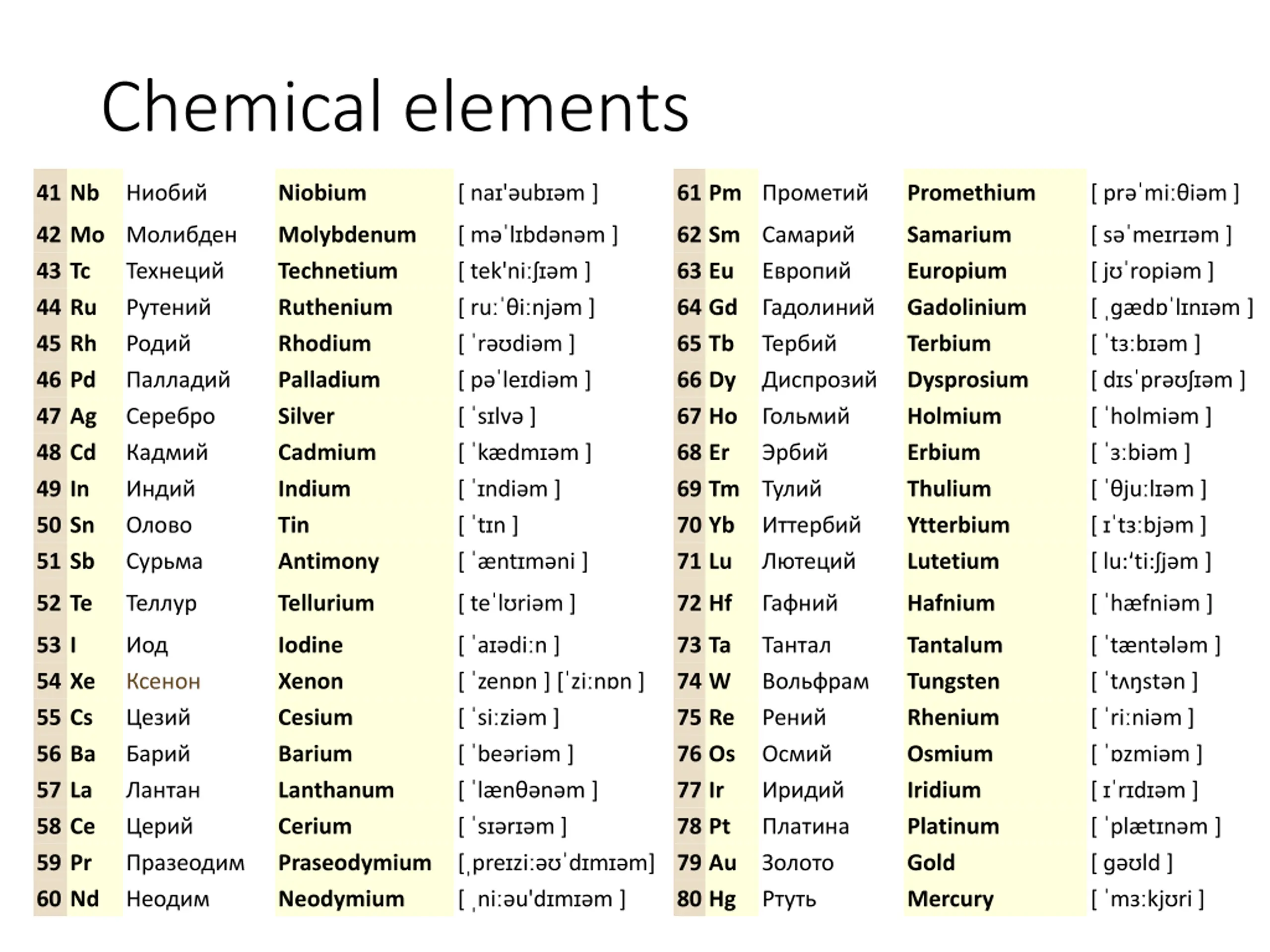 Chemical elements 41 Nb Niobium [ na ' ub m ] 61 Pm Promethium [ pr mi i m ] 42 Mo 43 Tc 44 Ru 45 Rh 46 Pd 47 Ag 48 Cd 49 In 50 Sn 51 Sb Molybdenum Technetium Ruthenium Rhodium Palladium Silver Cadmium Indium Tin Antimony [ m l bd n m ] [ tek'ni m ] [ ru i nj m ] [ r di m ] [ p le di m ] [ s lv ] [ k dm m ] [ ndi m ] [ t n ] [ nt m ni ] 62 Sm 63 Eu 64 Gd 65 Tb 66 Dy 67 Ho 68 Er 69 Tm 70 Yb 71 Lu Samarium Europium Gadolinium Terbium Dysprosium Holmium Erbium Thulium Ytterbium Lutetium [ s me r m ] [ j ropi m ] [ d l n m ] [ t b m ] [ d s pr m ] [ holmi m ] [ bi m ] [ ju l m ] [ t bj m ] [ lu: ti: j m ] 52 Te Tellurium [ te l ri m ] 72 Hf Hafnium [ h fni m ] 53 I 54 Xe 55 Cs 56 Ba 57 La 58 Ce 59 Pr 60 Nd Iodine Xenon Cesium Barium Lanthanum Cerium Praseodymium Neodymium [ a di n ] [ zen n ] [ zi n n ] [ si zi m ] [ be ri m ] [ l n n m ] [ s r m ] [ pre zi d m m] [ ni u'd m m ] 73 Ta 74 W 75 Re 76 Os 77 Ir 78 Pt 79 Au 80 Hg Tantalum Tungsten Rhenium Osmium Iridium Platinum Gold Mercury [ t nt l m ] [ t st n ] [ ri ni m ] [ zmi m ] [ r d m ] [ pl t n m ] [ ld ] [ m kj ri ]