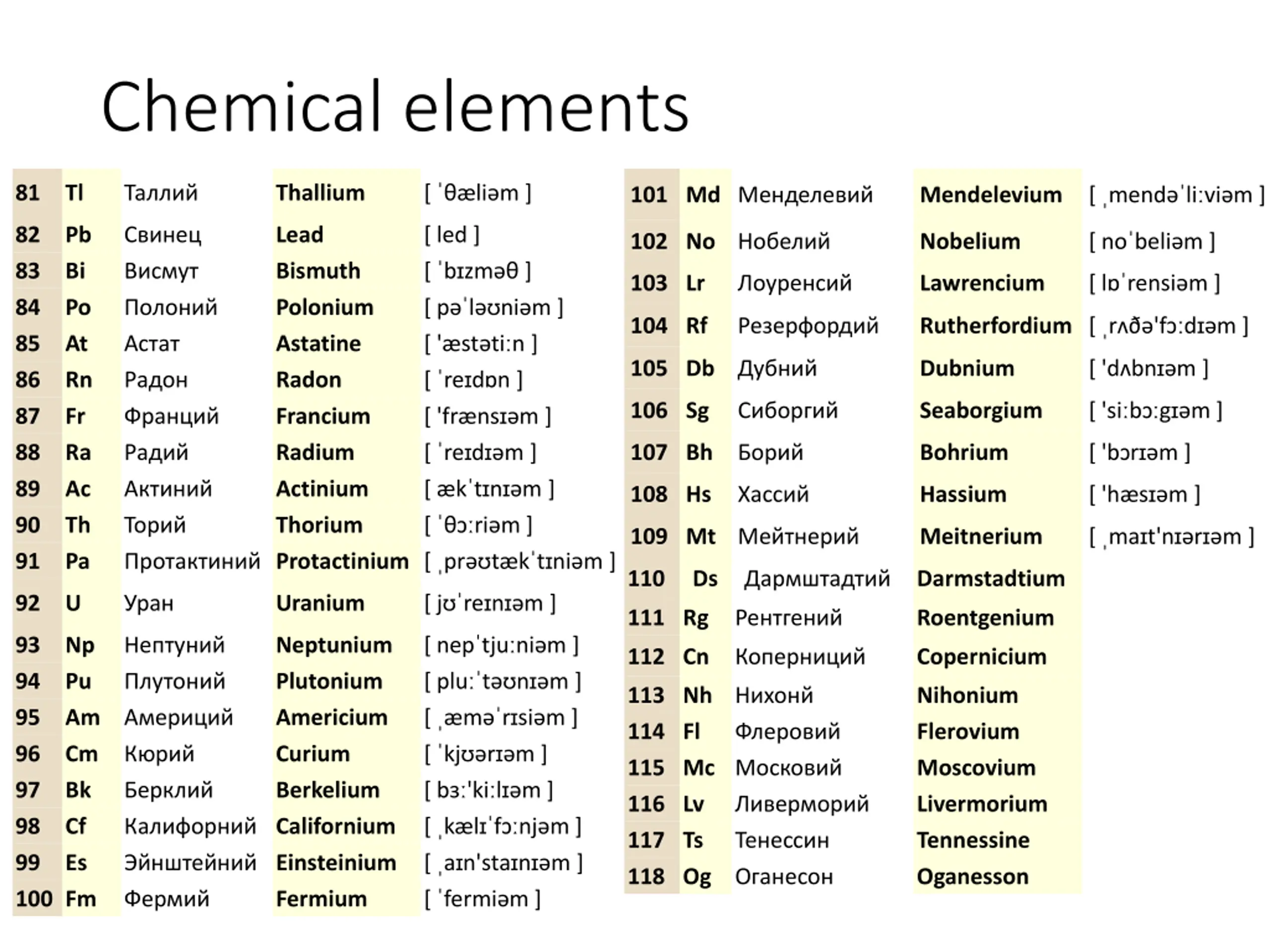 Chemical elements 81 Tl Thallium [ li m ] 101 Md Mendelevium [ mend li vi m ] 82 83 84 85 86 87 88 89 90 91 Pb Bi Po At Rn Fr Ra Ac Th Pa Protactinium [ pr t k t ni m ] Lead Bismuth Polonium Astatine Radon Francium Radium Actinium Thorium [ led ] [ b zm ] [ p l ni m ] [ ' st ti n ] [ re d n ] [ 'fr ns m ] [ re d m ] [ k t n m ] [ ri m ] 102 No Nobelium [ no beli m ] 103 Lr Lawrencium [ l rensi m ] 104 Rf Rutherfordium [ r 'f d m ] 105 Db Dubnium [ 'd bn m ] 106 Sg Seaborgium [ 'si b g m ] 107 Bh Bohrium [ 'b r m ] 108 Hs Hassium [ 'h s m ] 109 Mt Meitnerium [ ma t'n r m ] 110 Ds Darmstadtium 92 U Uranium [ j re n m ] 111 Rg Roentgenium 93 94 95 96 97 98 99 100 Fm Np Pu Am Cm Bk Cf Es Californium Einsteinium Neptunium Plutonium Americium Curium Berkelium [ nep tju ni m ] [ plu t n m ] [ m r si m ] [ kj r m ] [ b 'ki l m ] [ k l f nj m ] [ a n'sta n m ] [ fermi m ] 112 Cn Copernicium 113 Nh 114 Fl 115 Mc 116 Lv 117 Ts 118 Og Nihonium Flerovium Moscovium Livermorium Tennessine Oganesson Fermium