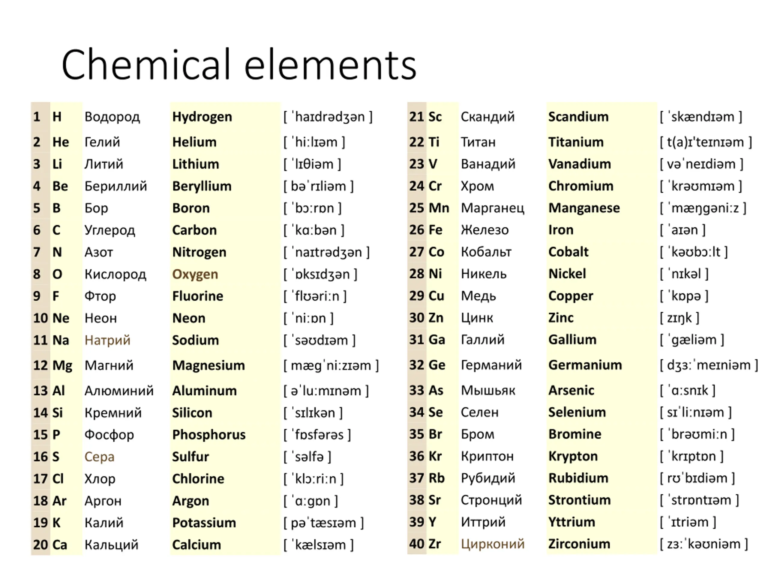 Chemical elements 1 H Hydrogen [ ha dr d n ] 21 Sc Scandium [ sk nd m ] 22 Ti 23 V 24 Cr 25 Mn 26 Fe 27 Co 28 Ni 29 Cu 30 Zn 31 Ga Titanium Vanadium Chromium Manganese Iron Cobalt Nickel Copper Zinc Gallium [ t(a) 'te n m ] [ v ne di m ] [ kr m m ] [ m ni z ] [ a n ] [ k b lt ] [ n k l ] [ k p ] [ z k ] [ li m ] 2 He 3 Li 4 Be 5 B 6 C 7 N 8 O 9 F 10 Ne 11 Na Helium Lithium Beryllium Boron Carbon Nitrogen Oxygen Fluorine Neon Sodium [ hi l m ] [ l i m ] [ b r li m ] [ b r n ] [ k b n ] [ na tr d n ] [ ks d n ] [ fl ri n ] [ ni n ] [ s d m ] 32 Ge Germanium [ d me ni m ] 12 Mg Magnesium [ m ni z m ] 33 As 34 Se 35 Br 36 Kr 37 Rb 38 Sr 39 Y 40 Zr Arsenic Selenium Bromine Krypton Rubidium Strontium Yttrium Zirconium [ sn k ] [ s li n m ] [ br mi n ] [ kr pt n ] [ r b di m ] [ str nt m ] [ tri m ] [ z k ni m ] 13 Al 14 Si 15 P 16 S 17 Cl 18 Ar 19 K 20 Ca Aluminum Silicon Phosphorus Sulfur Chlorine Argon Potassium Calcium [ lu m n m ] [ s l k n ] [ f sf r s ] [ s lf ] [ kl ri n ] [ n ] [ p t s m ] [ k ls m ]