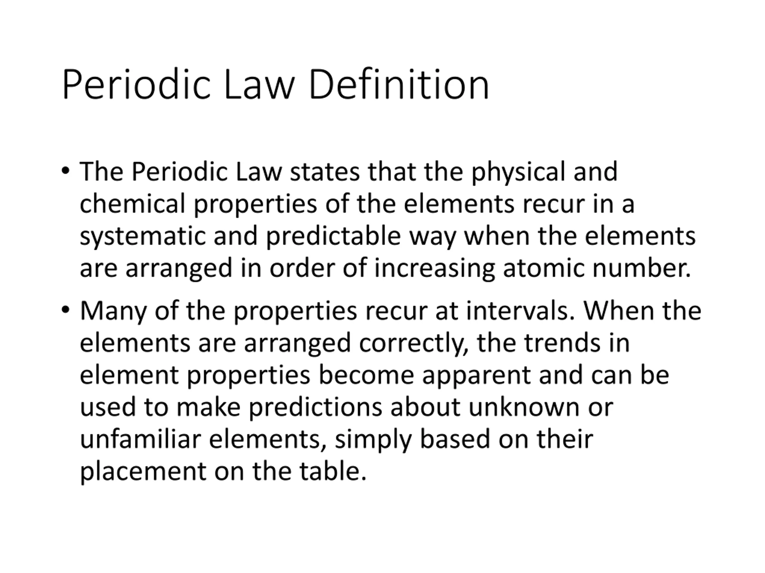 Periodic Law Definition The Periodic Law states that the physical and chemical properties of the elements recur in a systematic and predictable way when the elements are arranged in order of increasing atomic number. Many of the properties recur at intervals. When the elements are arranged correctly, the trends in element properties become apparent and can be used to make predictions about unknown or unfamiliar elements, simply based on their placement on the table.