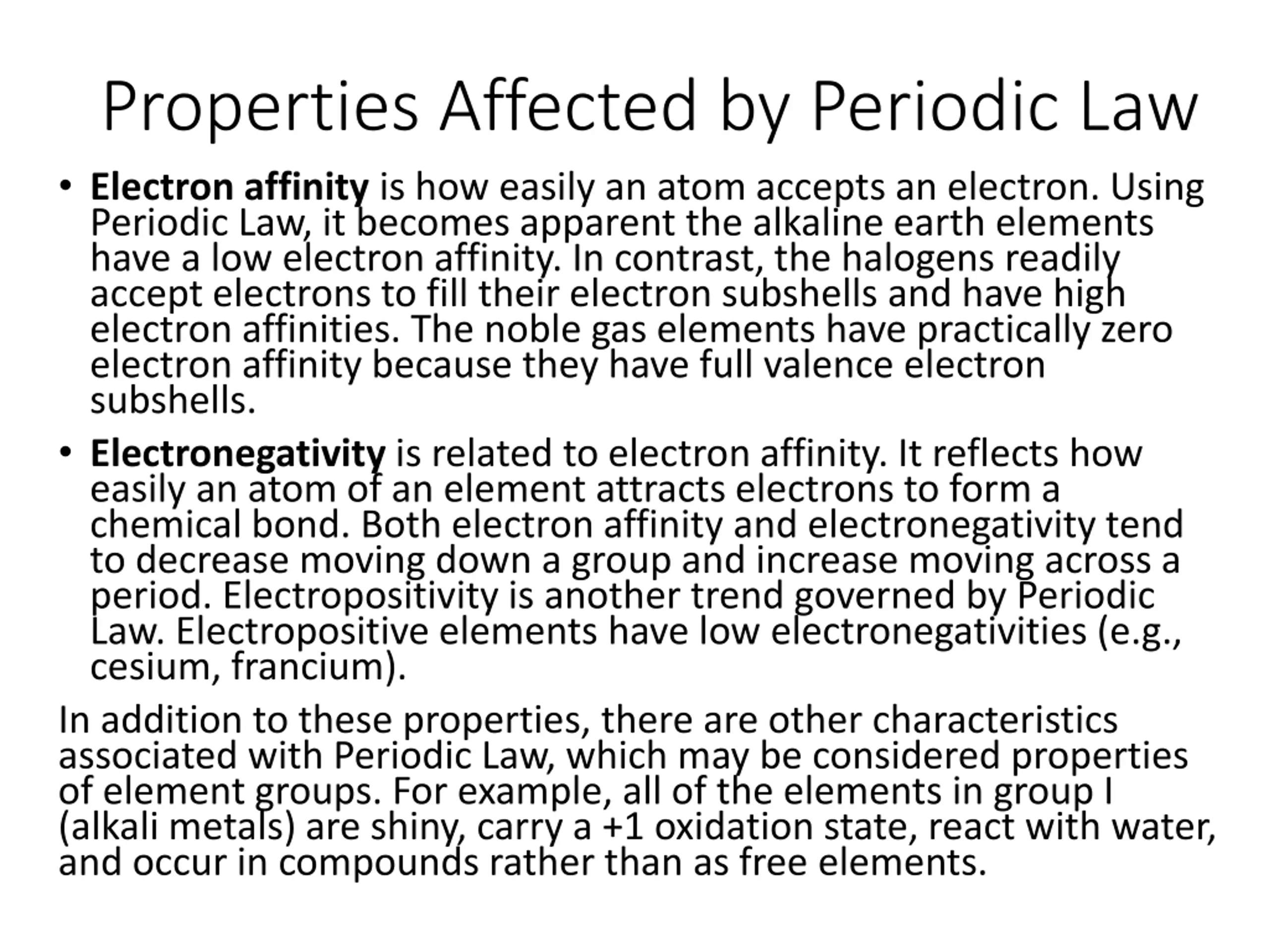 Properties Affected by Periodic Law Electron affinity is how easily an atom accepts an electron. Using Periodic Law, it becomes apparent the alkaline earth elements have a low electron affinity. In contrast, the halogens readily accept electrons to fill their electron subshells and have high electron affinities. The noble gas elements have practically zero electron affinity because they have full valence electron subshells. Electronegativity is related to electron affinity. It reflects how easily an atom of an element attracts electrons to form a chemical bond. Both electron affinity and electronegativity tend to decrease moving down a group and increase moving across a period. Electropositivity is another trend governed by Periodic Law. Electropositive elements have low electronegativities (e.g., cesium, francium). In addition to these properties, there are other characteristics associated with Periodic Law, which may be considered properties of element groups. For example, all of the elements in group I (alkali metals) are shiny, carry a +1 oxidation state, react with water, and occur in compounds rather than as free elements.