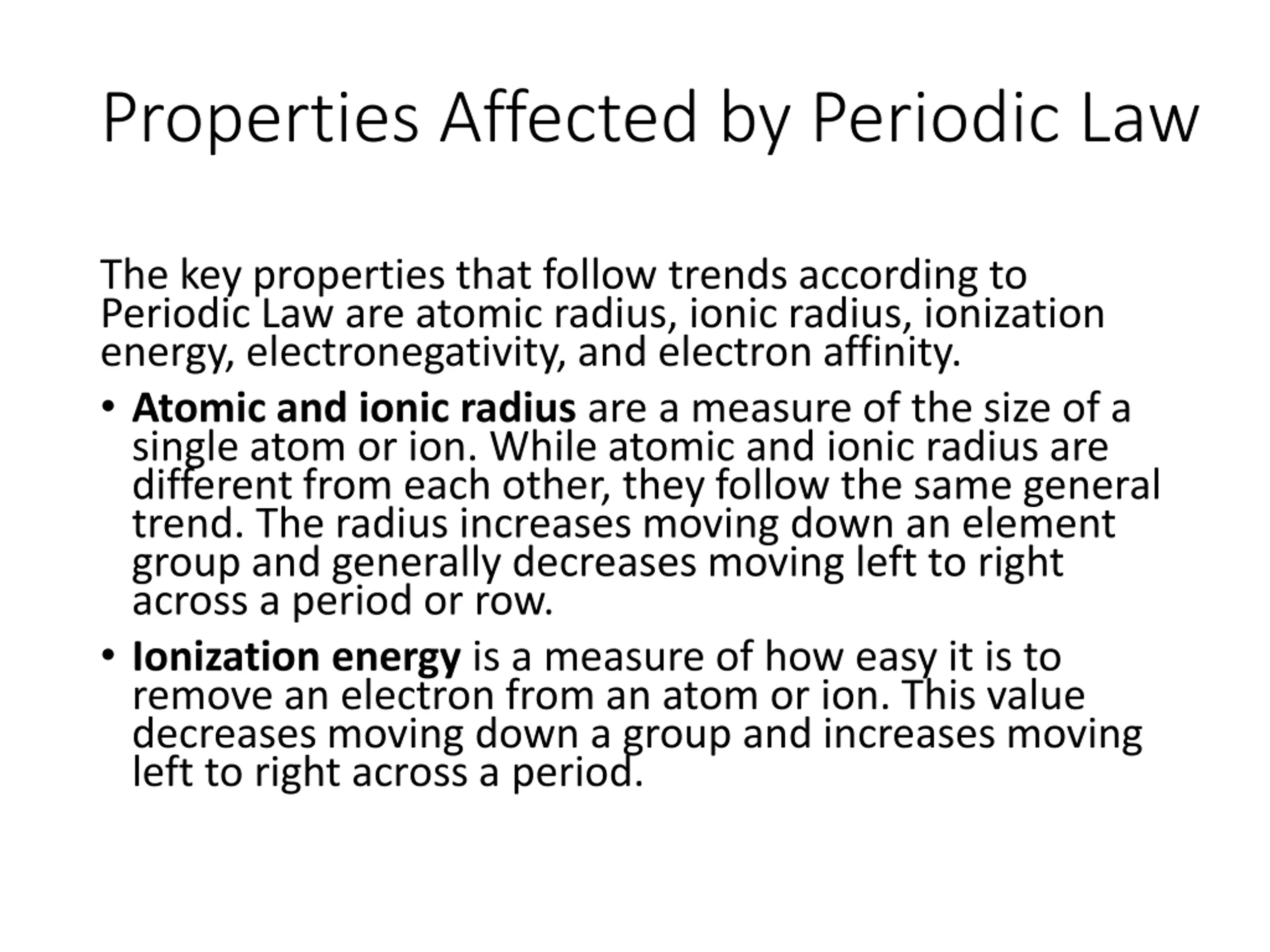 Properties Affected by Periodic Law The key properties that follow trends according to Periodic Law are atomic radius, ionic radius, ionization energy, electronegativity, and electron affinity. Atomic and ionic radius are a measure of the size of a single atom or ion. While atomic and ionic radius are different from each other, they follow the same general trend. The radius increases moving down an element group and generally decreases moving left to right across a period or row. Ionization energy is a measure of how easy it is to remove an electron from an atom or ion. This value decreases moving down a group and increases moving left to right across a period.