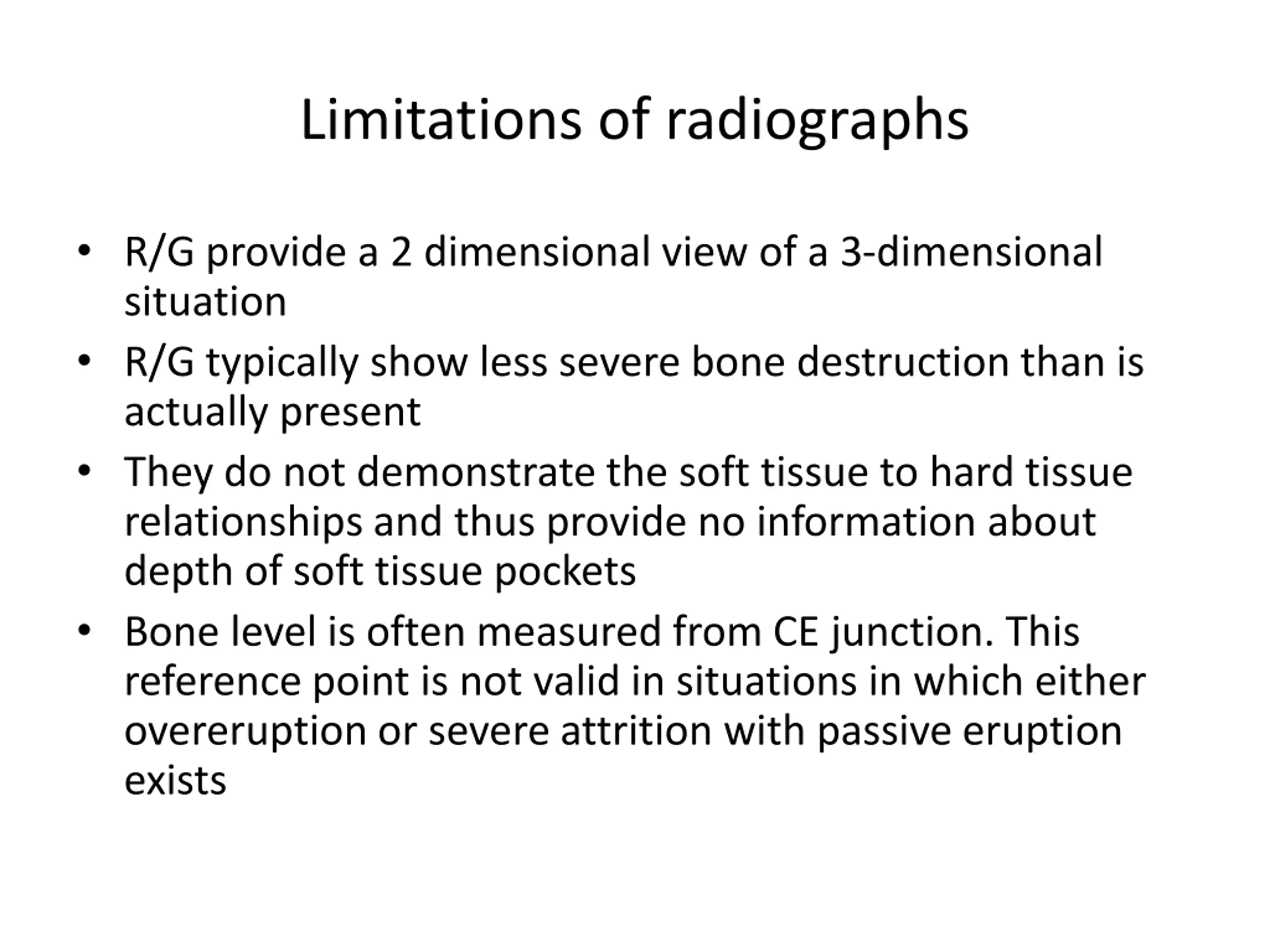 Limitations of radiographs R/G provide a 2 dimensional view of a 3-dimensional situation R/G typically show less severe bone destruction than is actually present They do not demonstrate the soft tissue to hard tissue relationships and thus provide no information about depth of soft tissue pockets Bone level is often measured from CE junction. This reference point is not valid in situations in which either overeruption or severe attrition with passive eruption exists