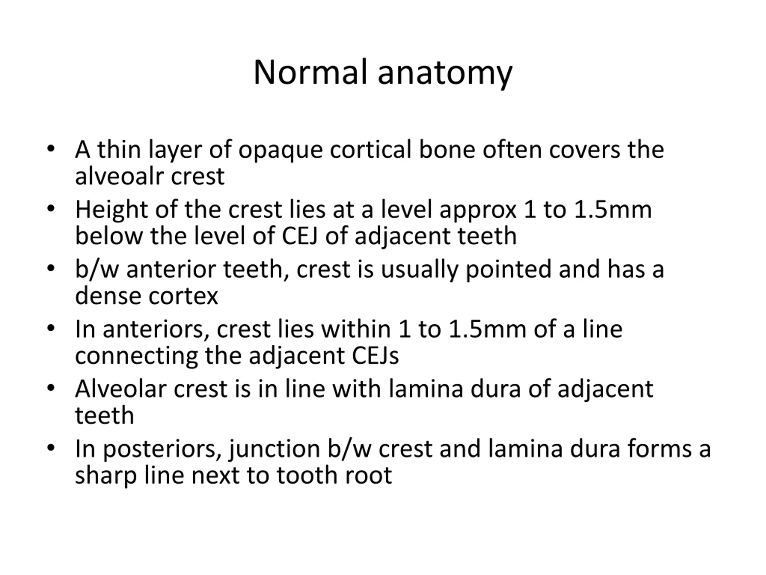 Normal anatomy A thin layer of opaque cortical bone often covers the alveoalr crest Height of the crest lies at a level approx 1 to 1.5mm below the level of CEJ of adjacent teeth b/w anterior teeth, crest is usually pointed and has a dense cortex In anteriors, crest lies within 1 to 1.5mm of a line connecting the adjacent CEJs Alveolar crest is in line with lamina dura of adjacent teeth In posteriors, junction b/w crest and lamina dura forms a sharp line next to tooth root