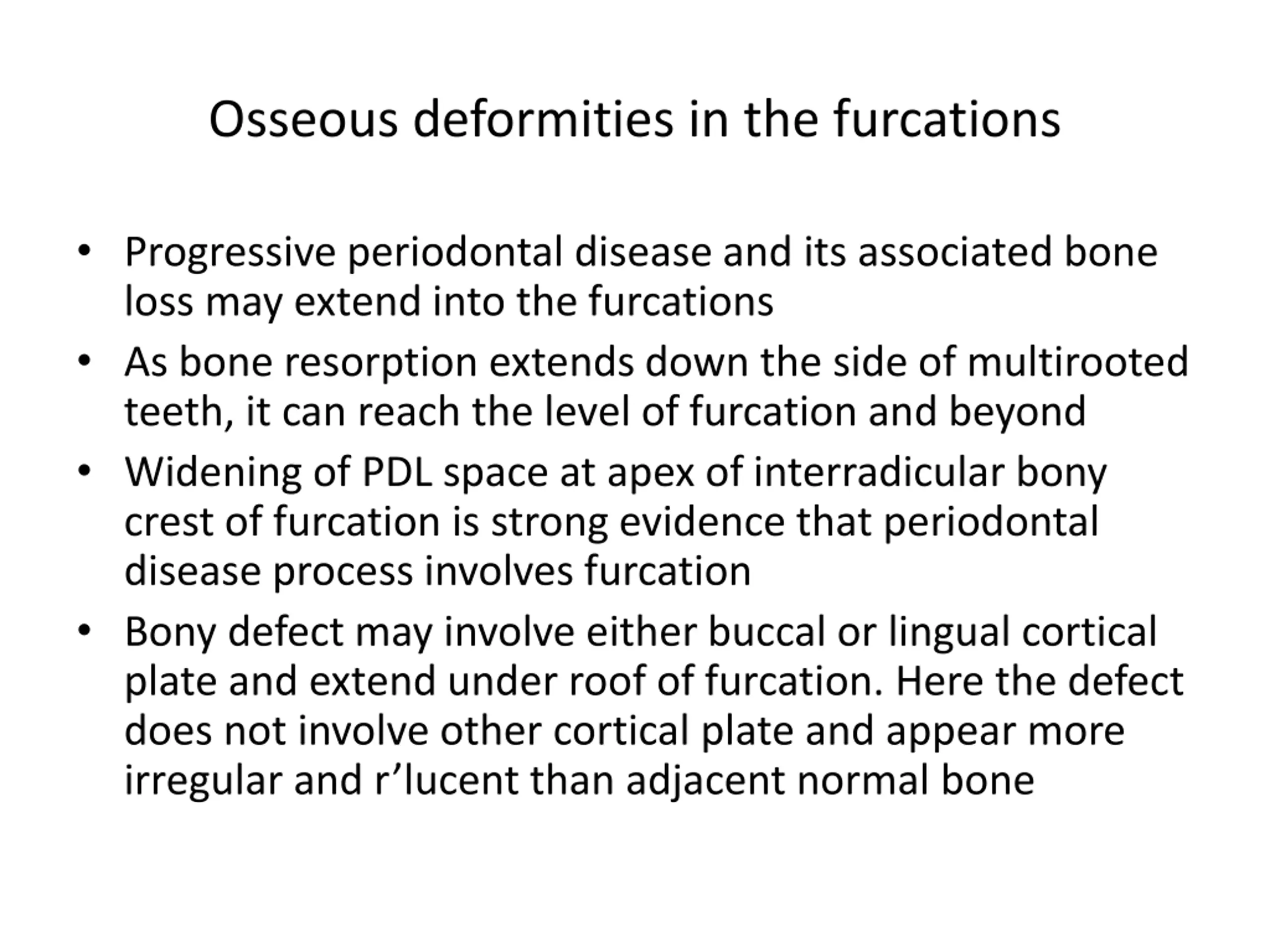 Osseous deformities in the furcations Progressive periodontal disease and its associated bone loss may extend into the furcations As bone resorption extends down the side of multirooted teeth, it can reach the level of furcation and beyond Widening of PDL space at apex of interradicular bony crest of furcation is strong evidence that periodontal disease process involves furcation Bony defect may involve either buccal or lingual cortical plate and extend under roof of furcation. Here the defect does not involve other cortical plate and appear more irregular and r lucent than adjacent normal bone