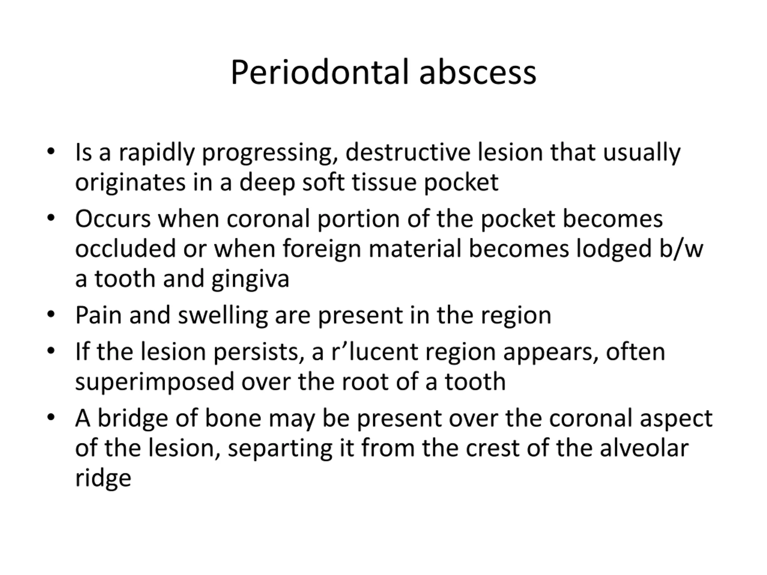 Periodontal abscess Is a rapidly progressing, destructive lesion that usually originates in a deep soft tissue pocket Occurs when coronal portion of the pocket becomes occluded or when foreign material becomes lodged b/w a tooth and gingiva Pain and swelling are present in the region If the lesion persists, a r lucent region appears, often superimposed over the root of a tooth A bridge of bone may be present over the coronal aspect of the lesion, separting it from the crest of the alveolar ridge