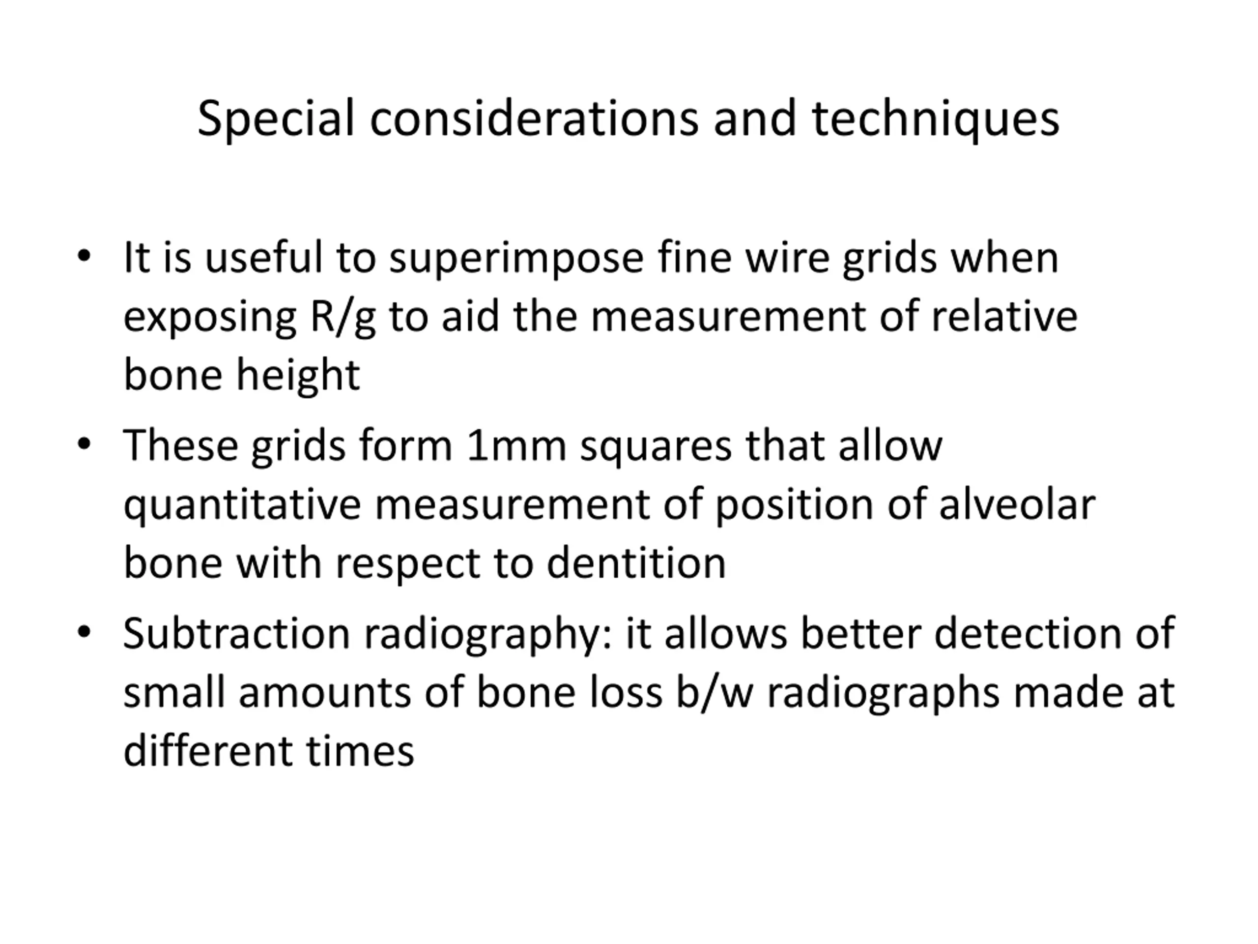 Special considerations and techniques It is useful to superimpose fine wire grids when exposing R/g to aid the measurement of relative bone height These grids form 1mm squares that allow quantitative measurement of position of alveolar bone with respect to dentition Subtraction radiography: it allows better detection of small amounts of bone loss b/w radiographs made at different times