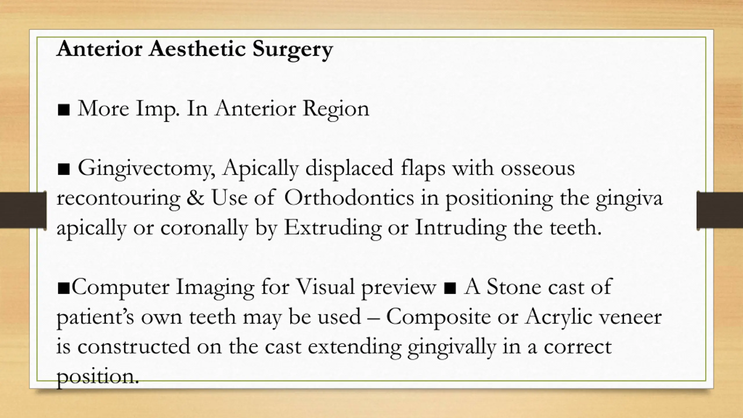 Anterior Aesthetic Surgery More Imp. In Anterior Region Gingivectomy, Apically displaced flaps with osseous recontouring & Use of Orthodontics in positioning the gingiva apically or coronally by Extruding or Intruding the teeth. Computer Imaging for Visual preview A Stone cast of patient s own teeth may be used Composite or Acrylic veneer is constructed on the cast extending gingivally in a correct position.
