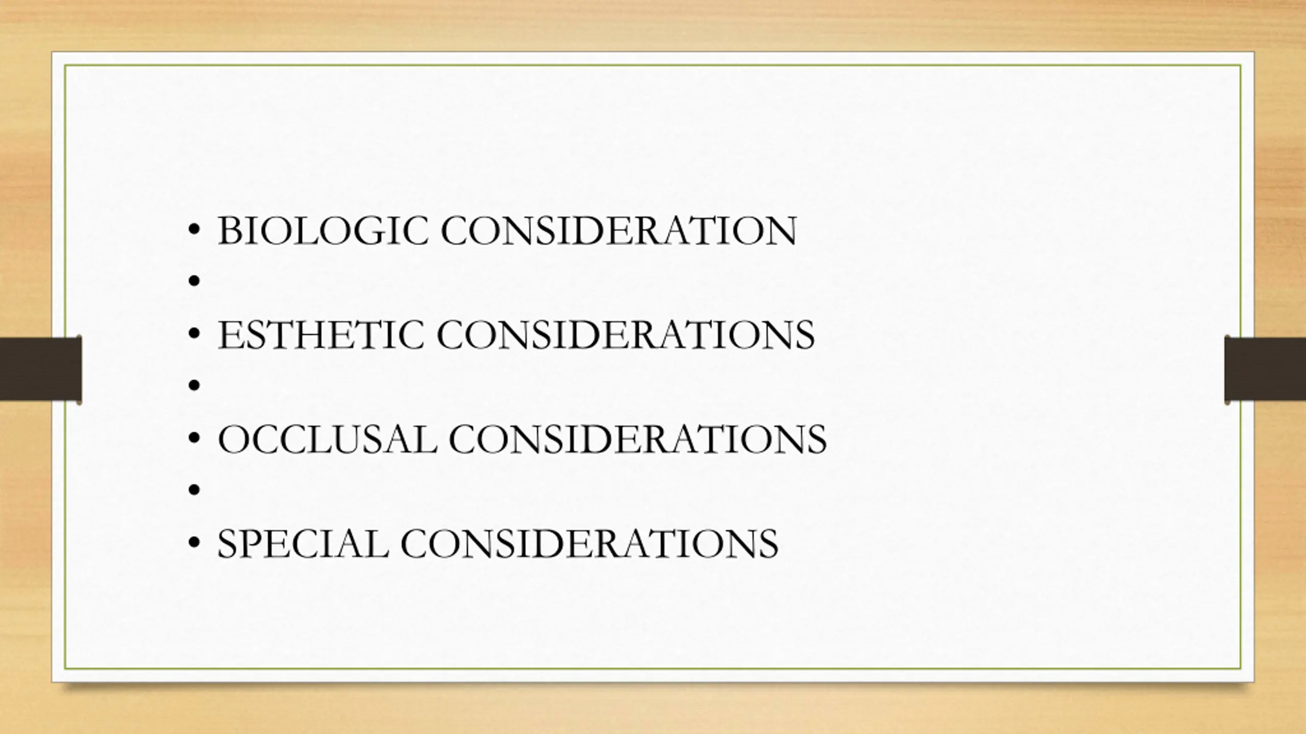 BIOLOGIC CONSIDERATION ESTHETIC CONSIDERATIONS OCCLUSAL CONSIDERATIONS SPECIAL CONSIDERATIONS
