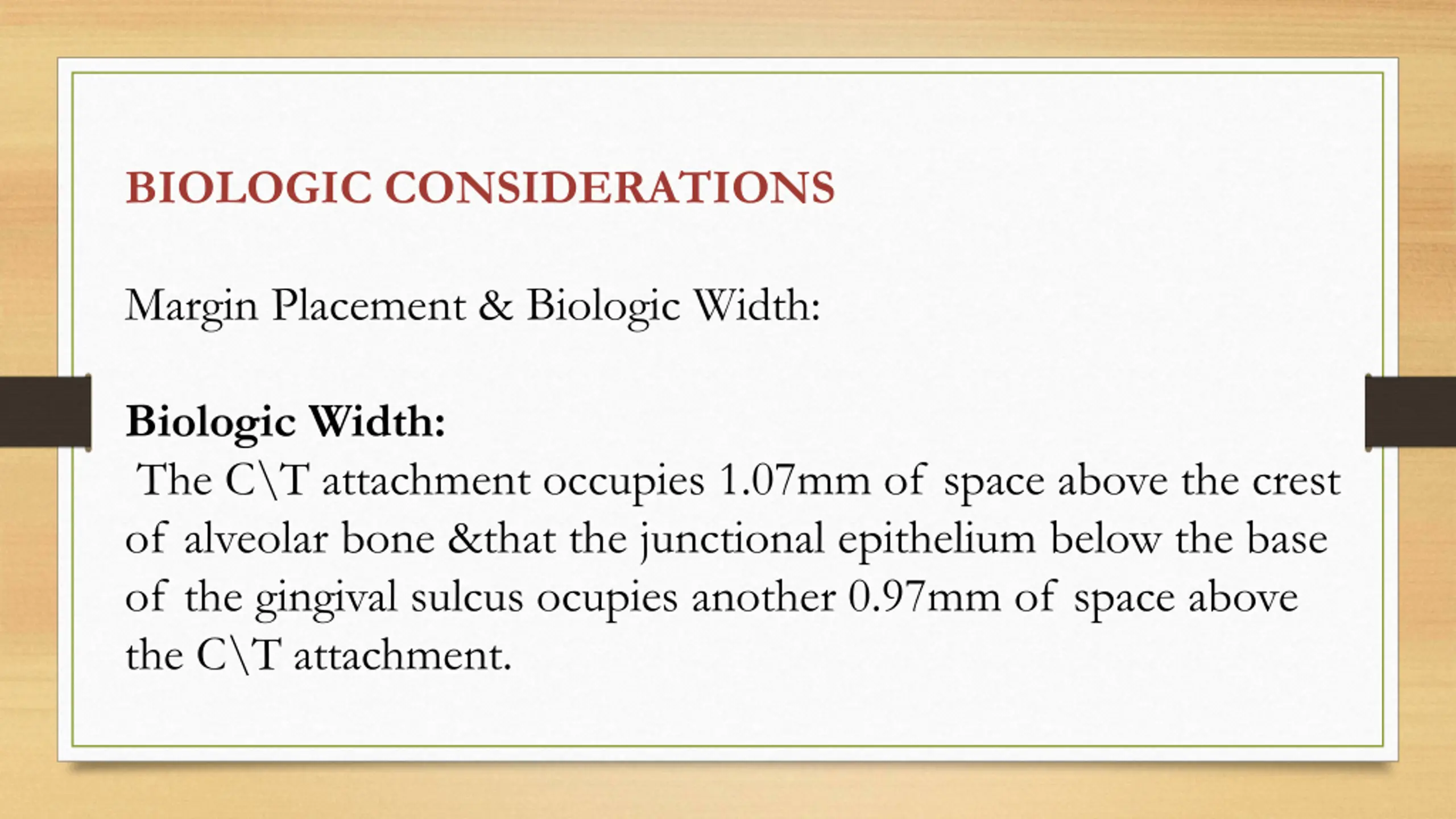 BIOLOGIC CONSIDERATIONS Margin Placement & Biologic Width: Biologic Width: The C\T attachment occupies 1.07mm of space above the crest of alveolar bone &that the junctional epithelium below the base of the gingival sulcus ocupies another 0.97mm of space above the C\T attachment.