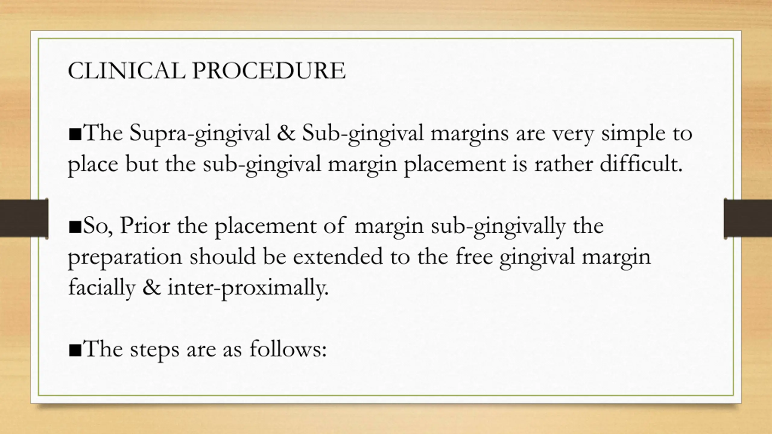 CLINICAL PROCEDURE The Supra-gingival & Sub-gingival margins are very simple to place but the sub-gingival margin placement is rather difficult. So, Prior the placement of margin sub-gingivally the preparation should be extended to the free gingival margin facially & inter-proximally. The steps are as follows: