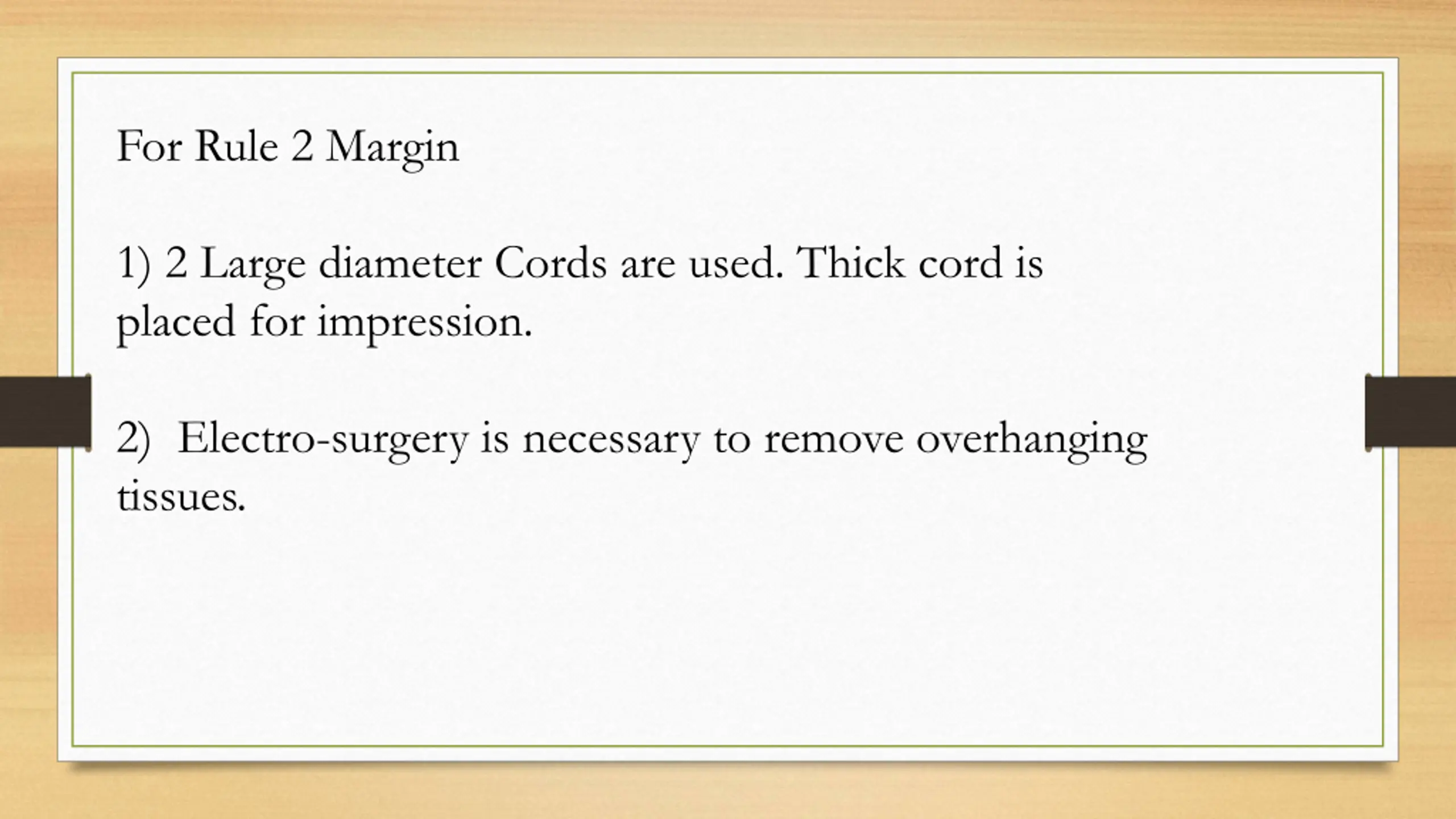 For Rule 2 Margin 1) 2 Large diameter Cords are used. Thick cord is placed for impression. 2) Electro-surgery is necessary to remove overhanging tissues.