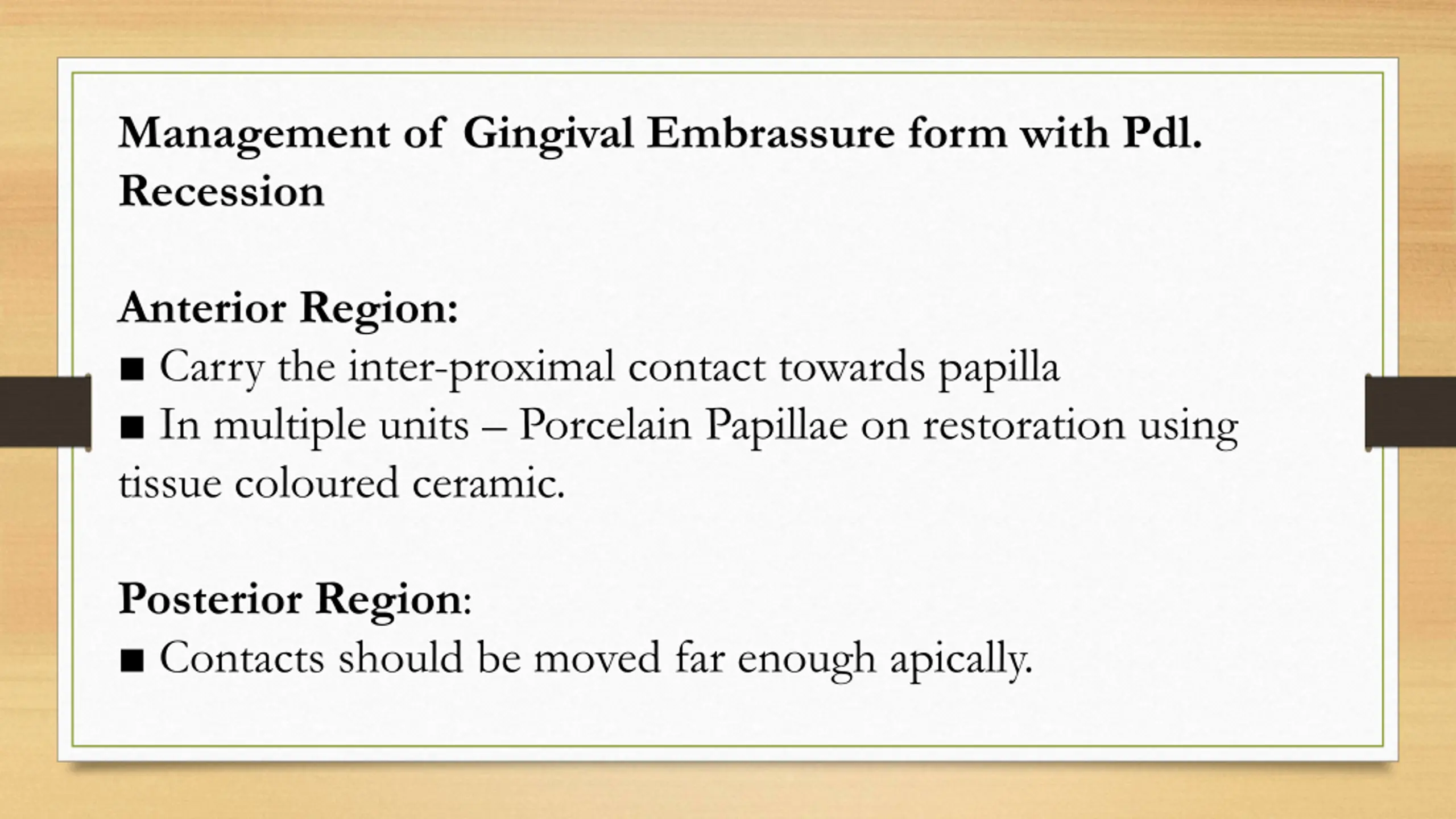 Management of Gingival Embrassure form with Pdl. Recession Anterior Region: Carry the inter-proximal contact towards papilla In multiple units Porcelain Papillae on restoration using tissue coloured ceramic. Posterior Region: Contacts should be moved far enough apically.