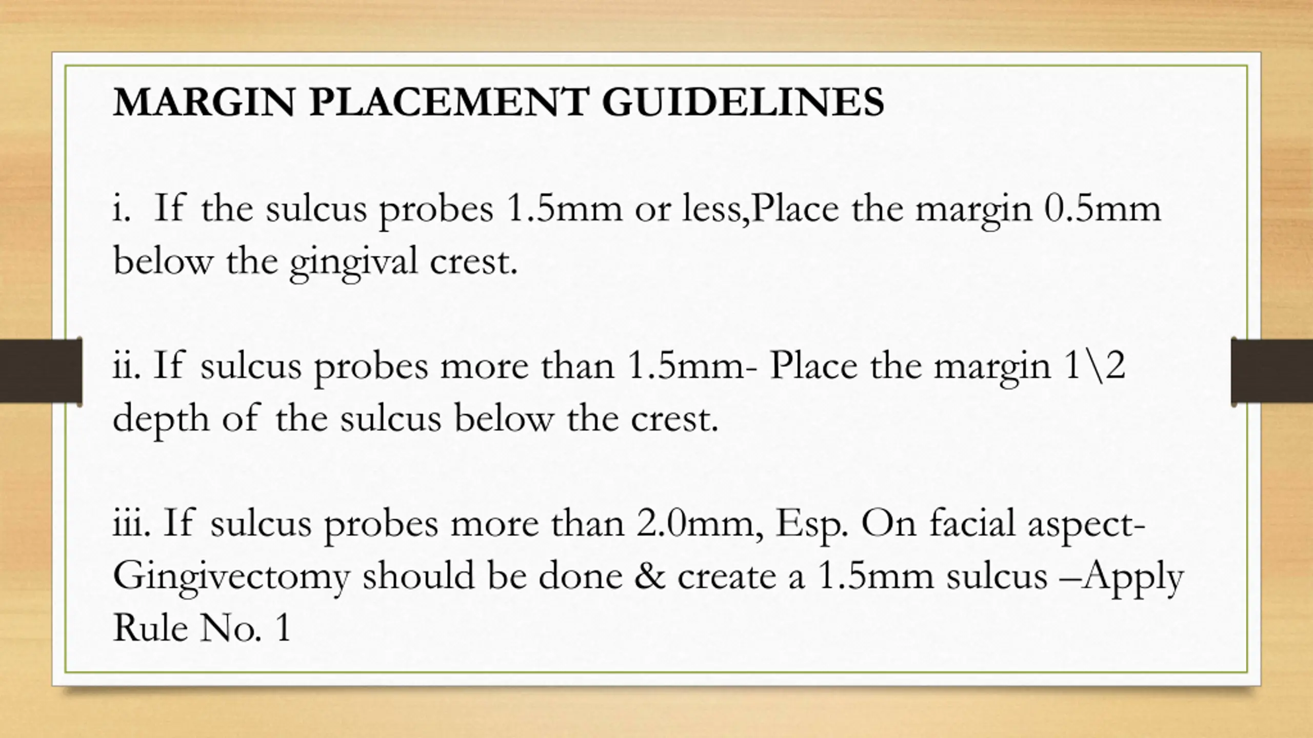 MARGIN PLACEMENT GUIDELINES i. If the sulcus probes 1.5mm or less,Place the margin 0.5mm below the gingival crest. ii. If sulcus probes more than 1.5mm- Place the margin 1\2 depth of the sulcus below the crest. iii. If sulcus probes more than 2.0mm, Esp. On facial aspect- Gingivectomy should be done & create a 1.5mm sulcus Apply Rule No. 1