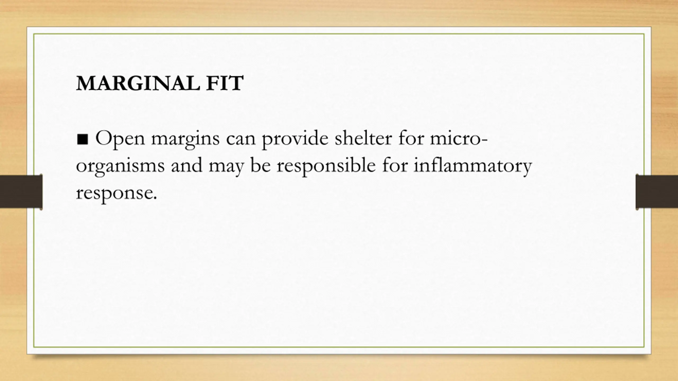MARGINAL FIT Open margins can provide shelter for micro- organisms and may be responsible for inflammatory response.