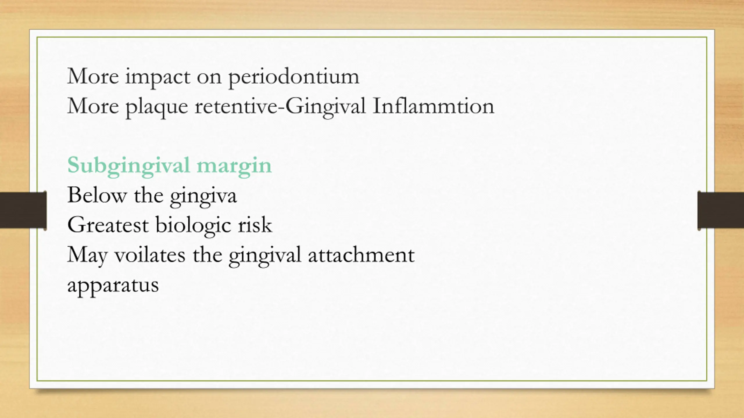 More impact on periodontium More plaque retentive-Gingival Inflammtion Subgingival margin Below the gingiva Greatest biologic risk May voilates the gingival attachment apparatus