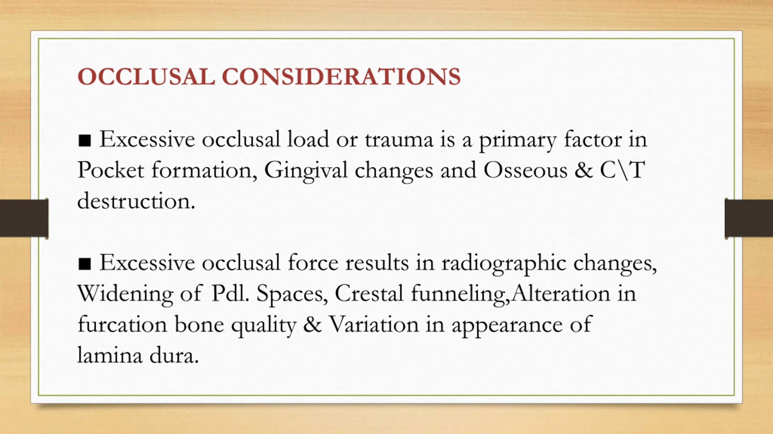OCCLUSAL CONSIDERATIONS Excessive occlusal load or trauma is a primary factor in Pocket formation, Gingival changes and Osseous & C\T destruction. Excessive occlusal force results in radiographic changes, Widening of Pdl. Spaces, Crestal funneling,Alteration in furcation bone quality & Variation in appearance of lamina dura.