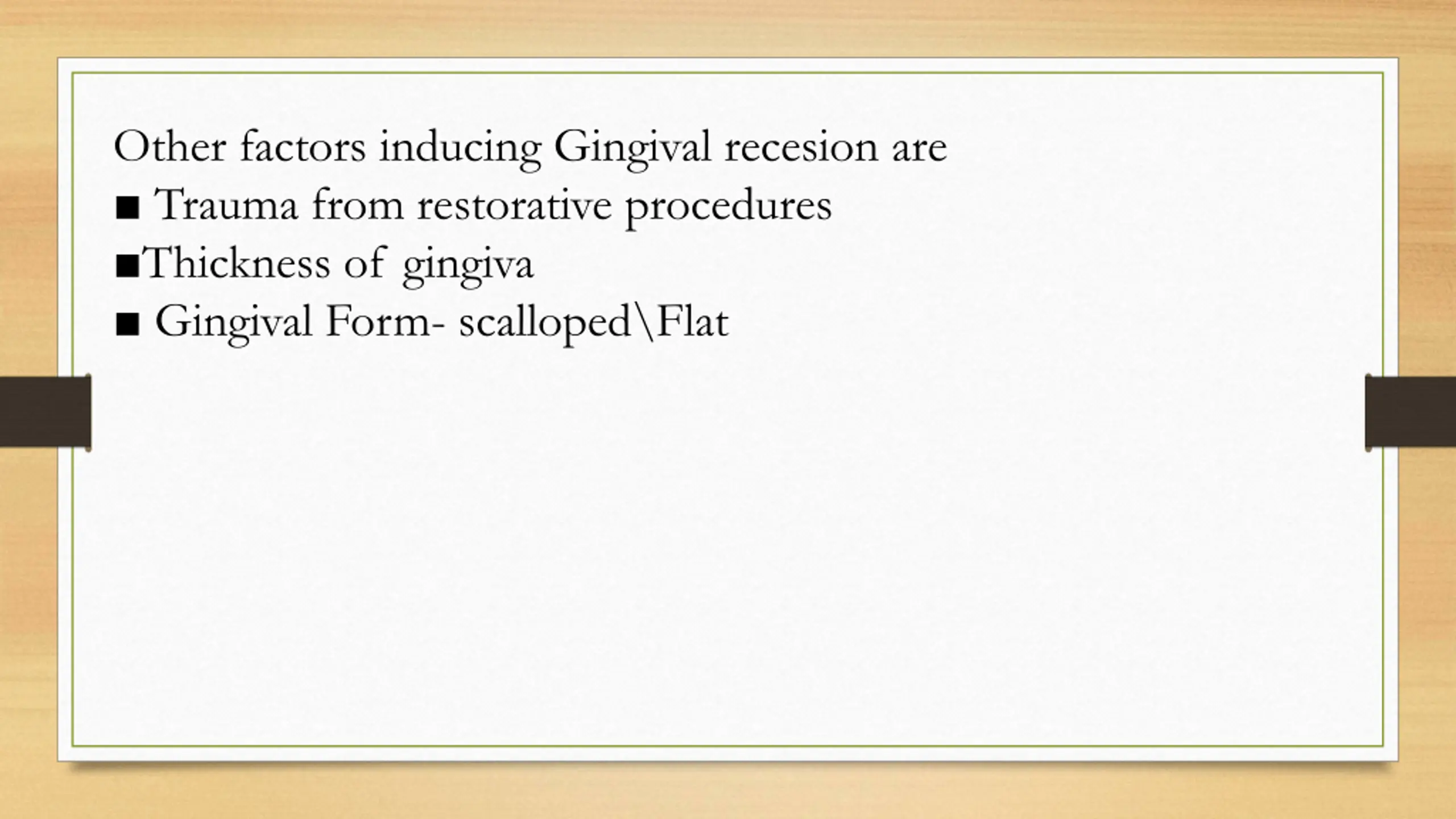 Other factors inducing Gingival recesion are Trauma from restorative procedures Thickness of gingiva Gingival Form- scalloped\Flat