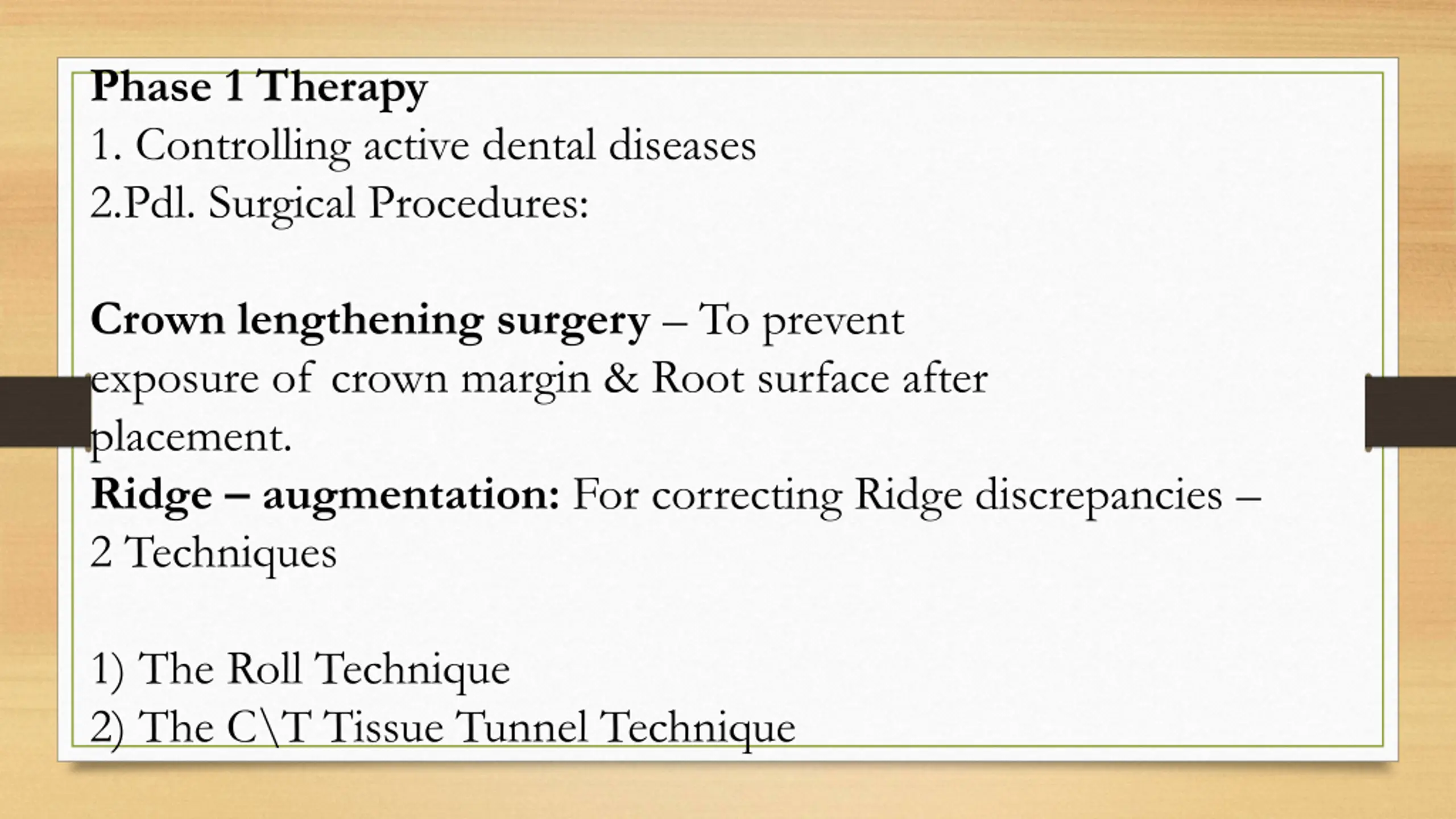 Phase 1 Therapy 1. Controlling active dental diseases 2.Pdl. Surgical Procedures: Crown lengthening surgery To prevent exposure of crown margin & Root surface after placement. Ridge augmentation: For correcting Ridge discrepancies 2 Techniques 1) The Roll Technique 2) The C\T Tissue Tunnel Technique