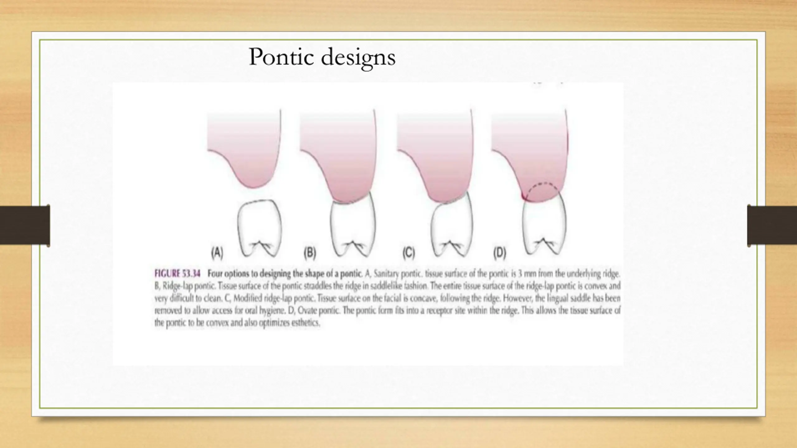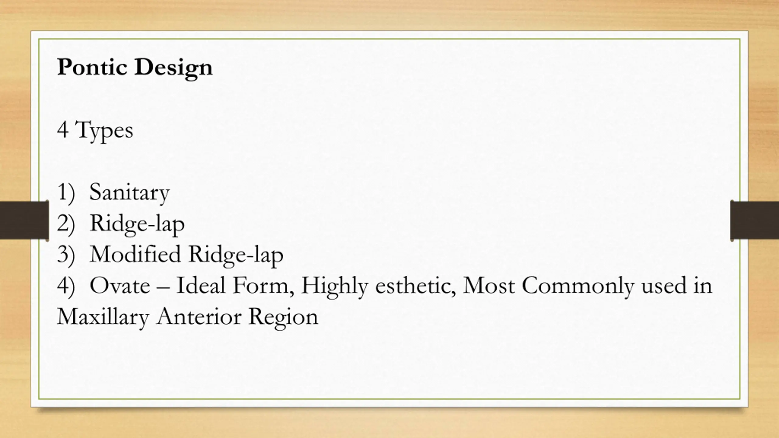 Pontic Design 4 Types 1) Sanitary 2) Ridge-lap 3) Modified Ridge-lap 4) Ovate Ideal Form, Highly esthetic, Most Commonly used in Maxillary Anterior Region