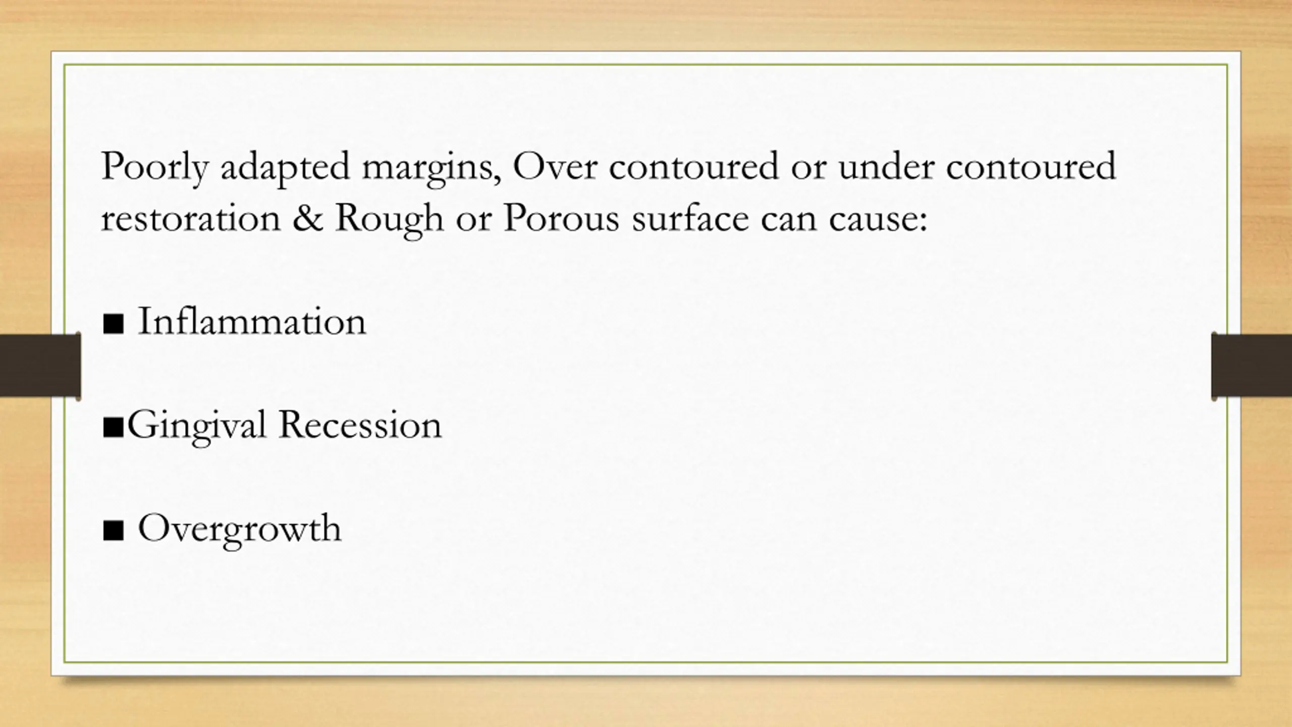 Poorly adapted margins, Over contoured or under contoured restoration & Rough or Porous surface can cause: Inflammation Gingival Recession Overgrowth