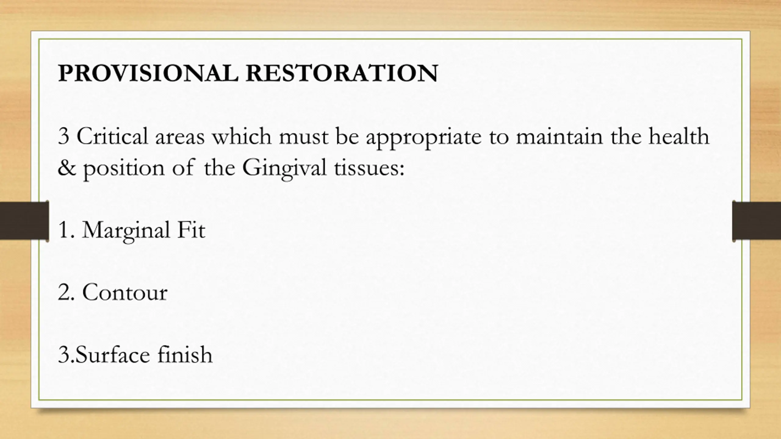 PROVISIONAL RESTORATION 3 Critical areas which must be appropriate to maintain the health & position of the Gingival tissues: 1. Marginal Fit 2. Contour 3.Surface finish