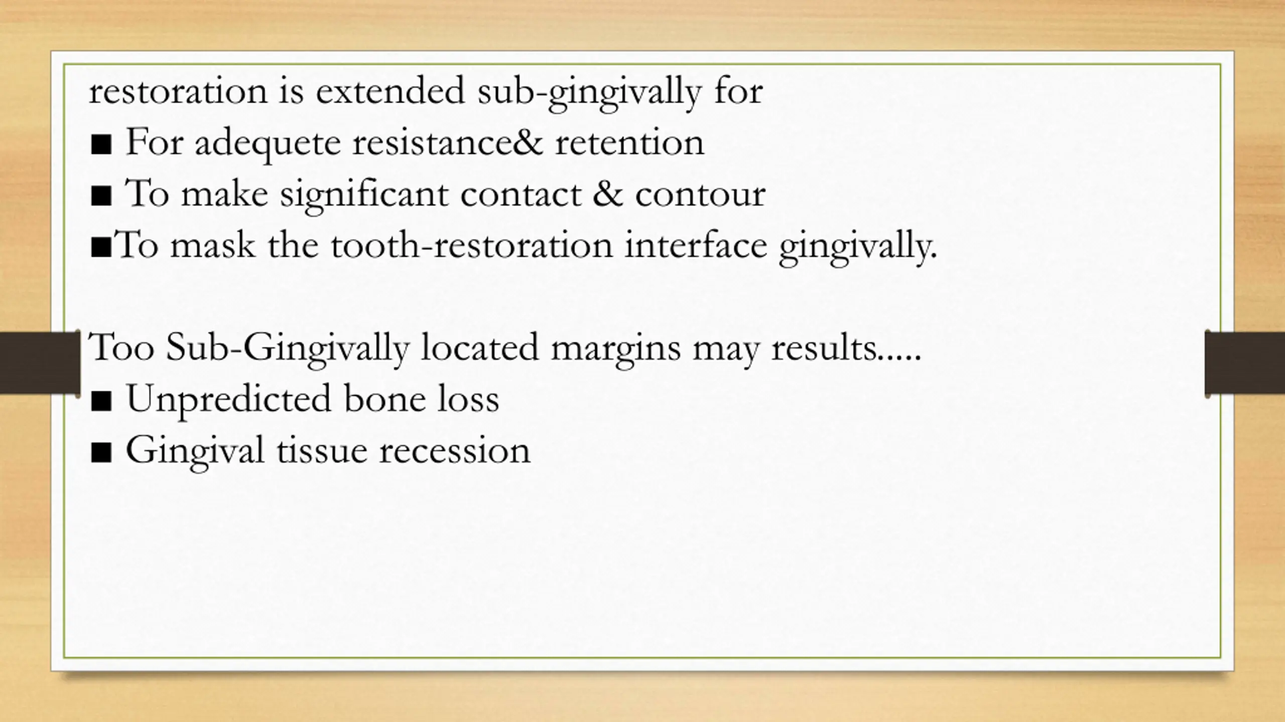 restoration is extended sub-gingivally for For adequete resistance& retention To make significant contact & contour To mask the tooth-restoration interface gingivally. Too Sub-Gingivally located margins may results..... Unpredicted bone loss Gingival tissue recession