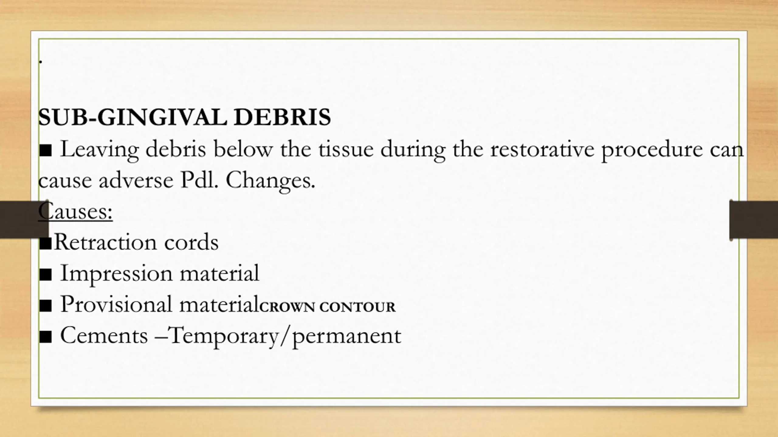 . SUB-GINGIVAL DEBRIS Leaving debris below the tissue during the restorative procedure can cause adverse Pdl. Changes. Causes: Retraction cords Impression material Provisional materialCROWN CONTOUR Cements Temporary/permanent