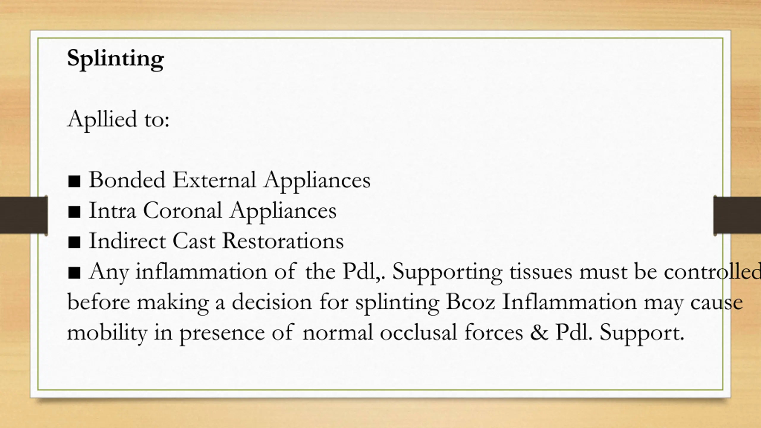 Splinting Apllied to: Bonded External Appliances Intra Coronal Appliances Indirect Cast Restorations Any inflammation of the Pdl,. Supporting tissues must be controlled before making a decision for splinting Bcoz Inflammation may cause mobility in presence of normal occlusal forces & Pdl. Support.
