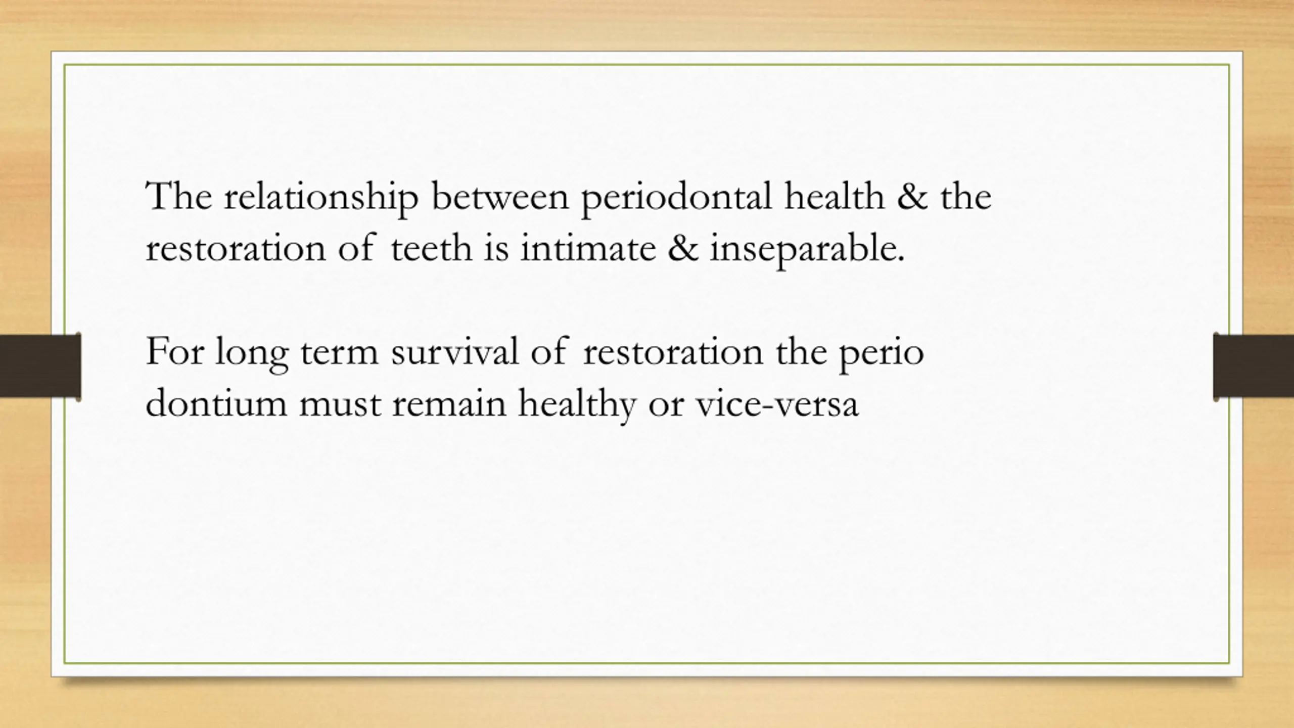 The relationship between periodontal health & the restoration of teeth is intimate & inseparable. For long term survival of restoration the perio dontium must remain healthy or vice-versa