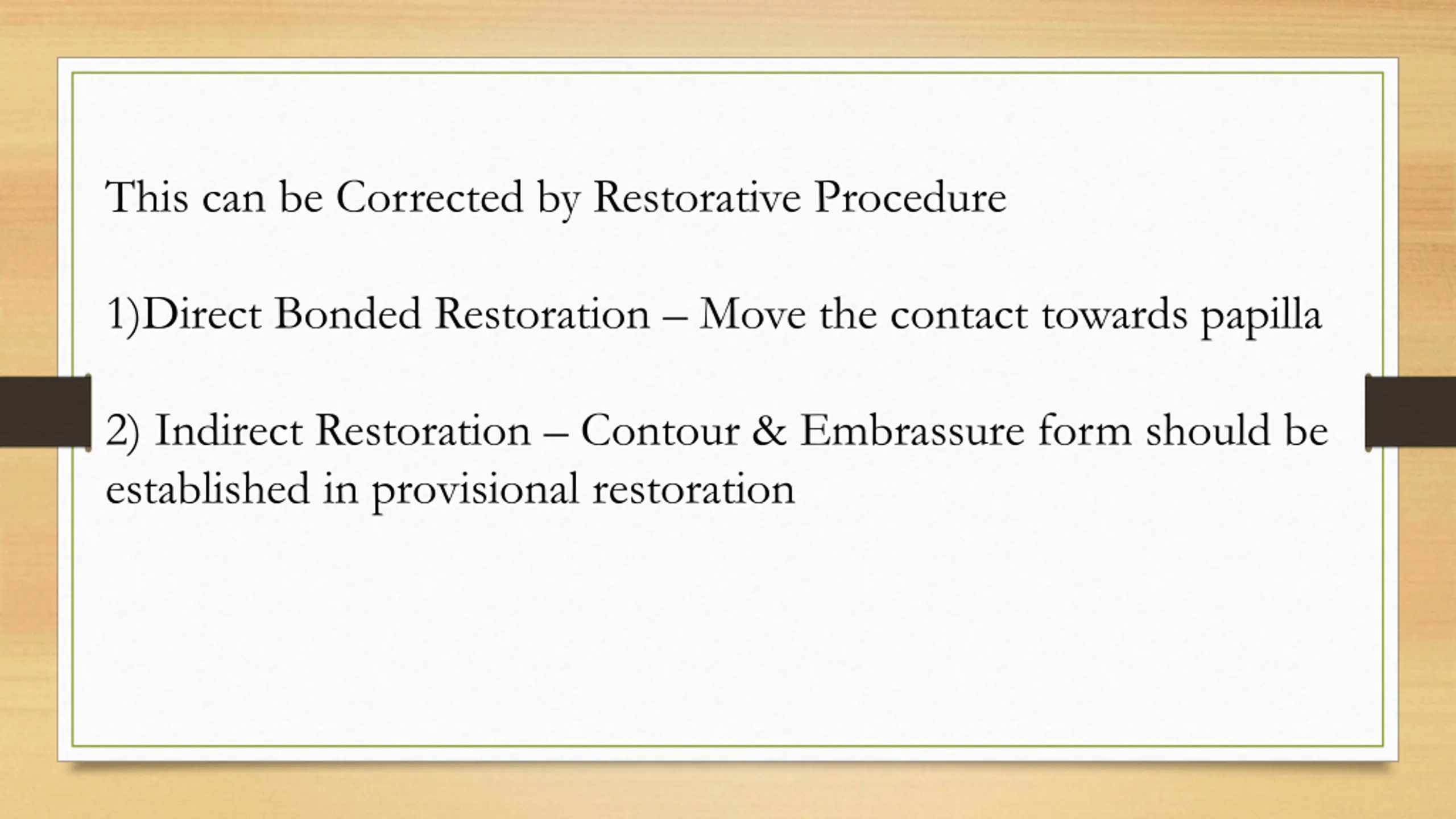 This can be Corrected by Restorative Procedure 1)Direct Bonded Restoration Move the contact towards papilla 2) Indirect Restoration Contour & Embrassure form should be established in provisional restoration