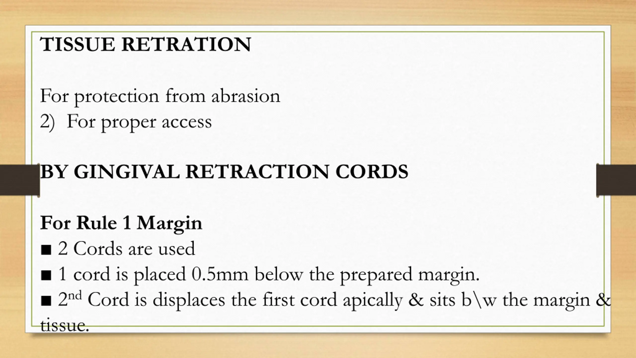 TISSUE RETRATION For protection from abrasion 2) For proper access BY GINGIVAL RETRACTION CORDS For Rule 1 Margin 2 Cords are used 1 cord is placed 0.5mm below the prepared margin. 2nd Cord is displaces the first cord apically & sits b\w the margin & tissue.