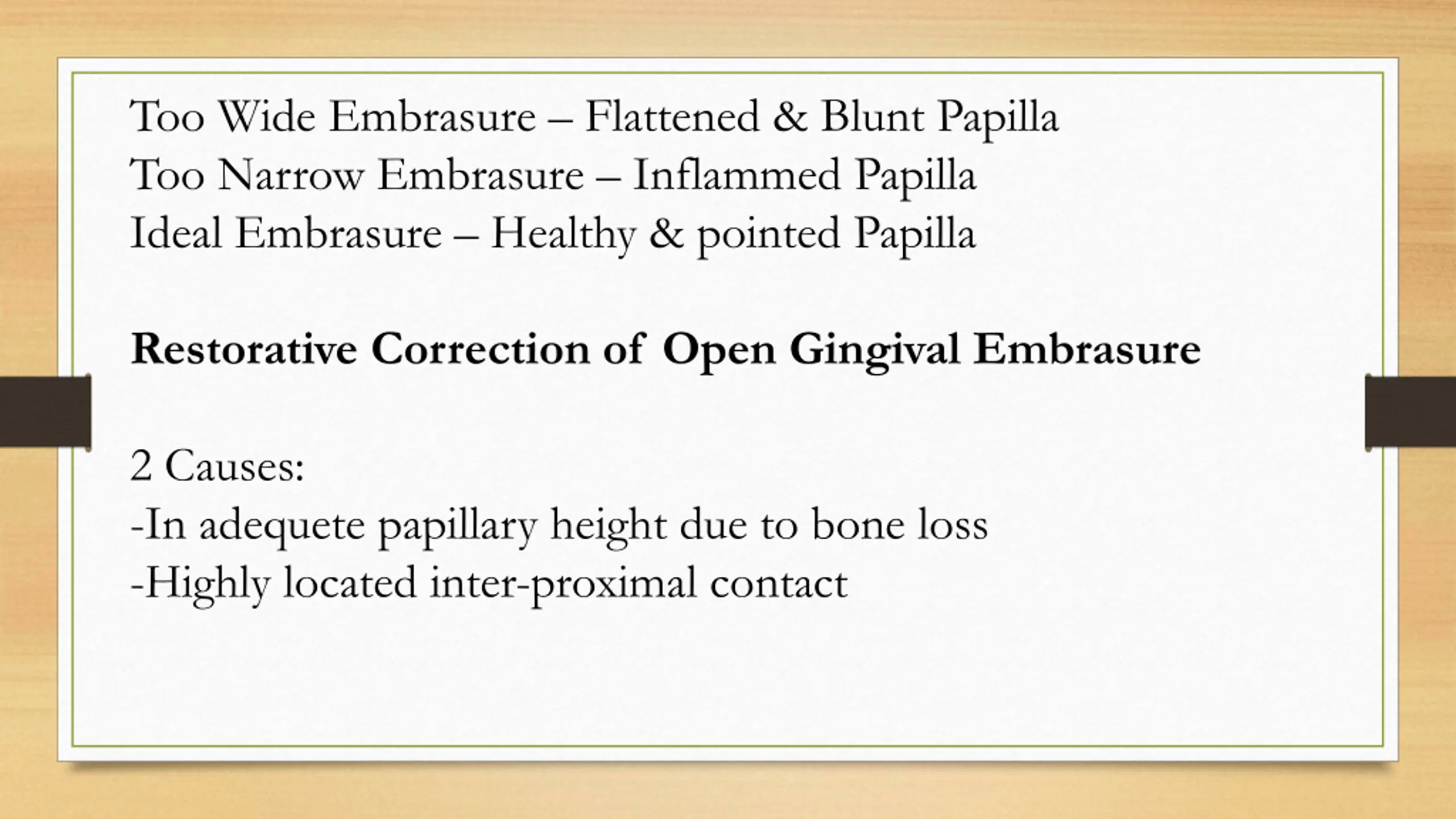 Too Wide Embrasure Flattened & Blunt Papilla Too Narrow Embrasure Inflammed Papilla Ideal Embrasure Healthy & pointed Papilla Restorative Correction of Open Gingival Embrasure 2 Causes: -In adequete papillary height due to bone loss -Highly located inter-proximal contact
