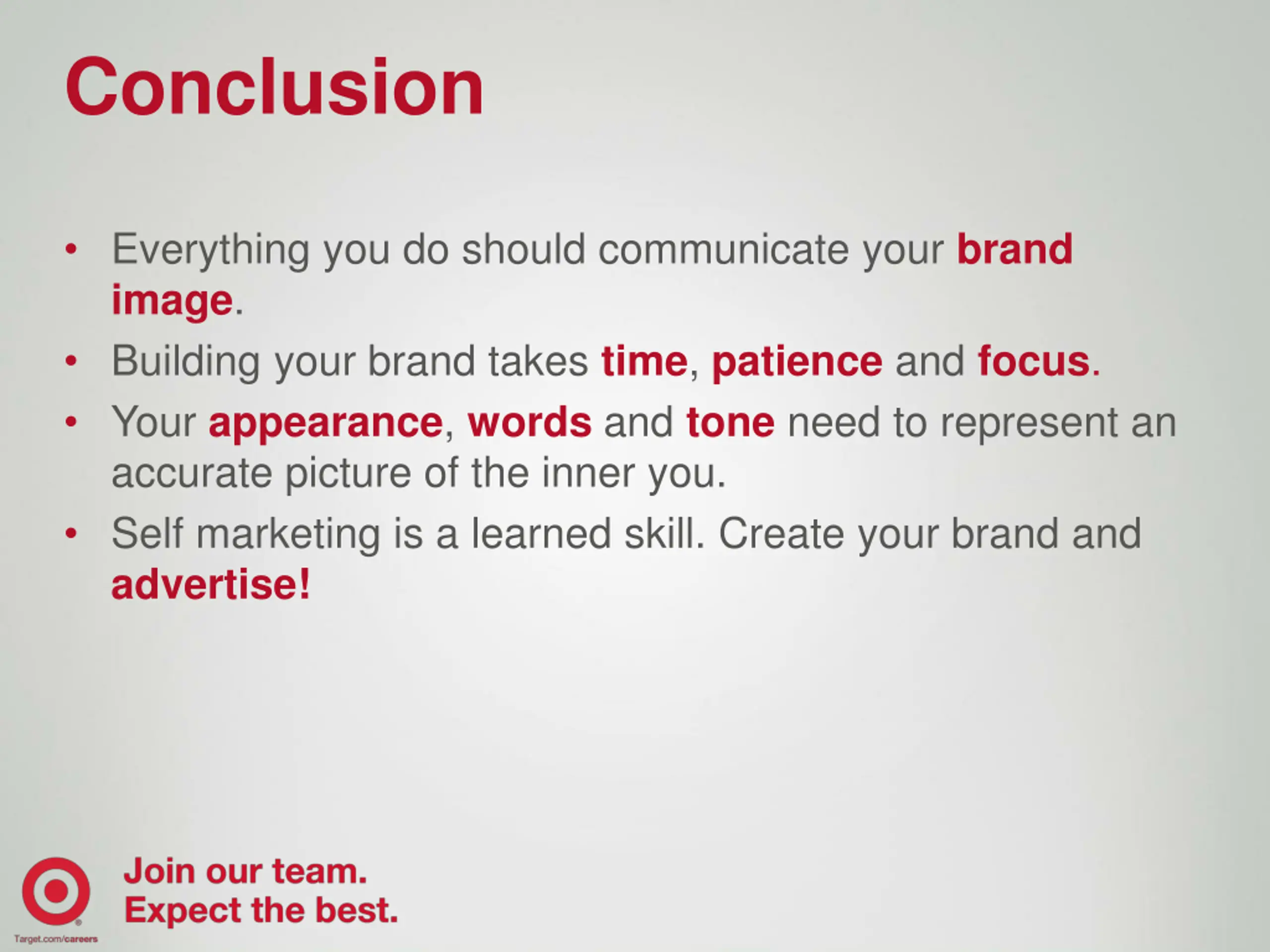 Conclusion Everything you do should communicate your brand image. Building your brand takes time, patience and focus. Your appearance, words and tone need to represent an accurate picture of the inner you. Self marketing is a learned skill. Create your brand and advertise!