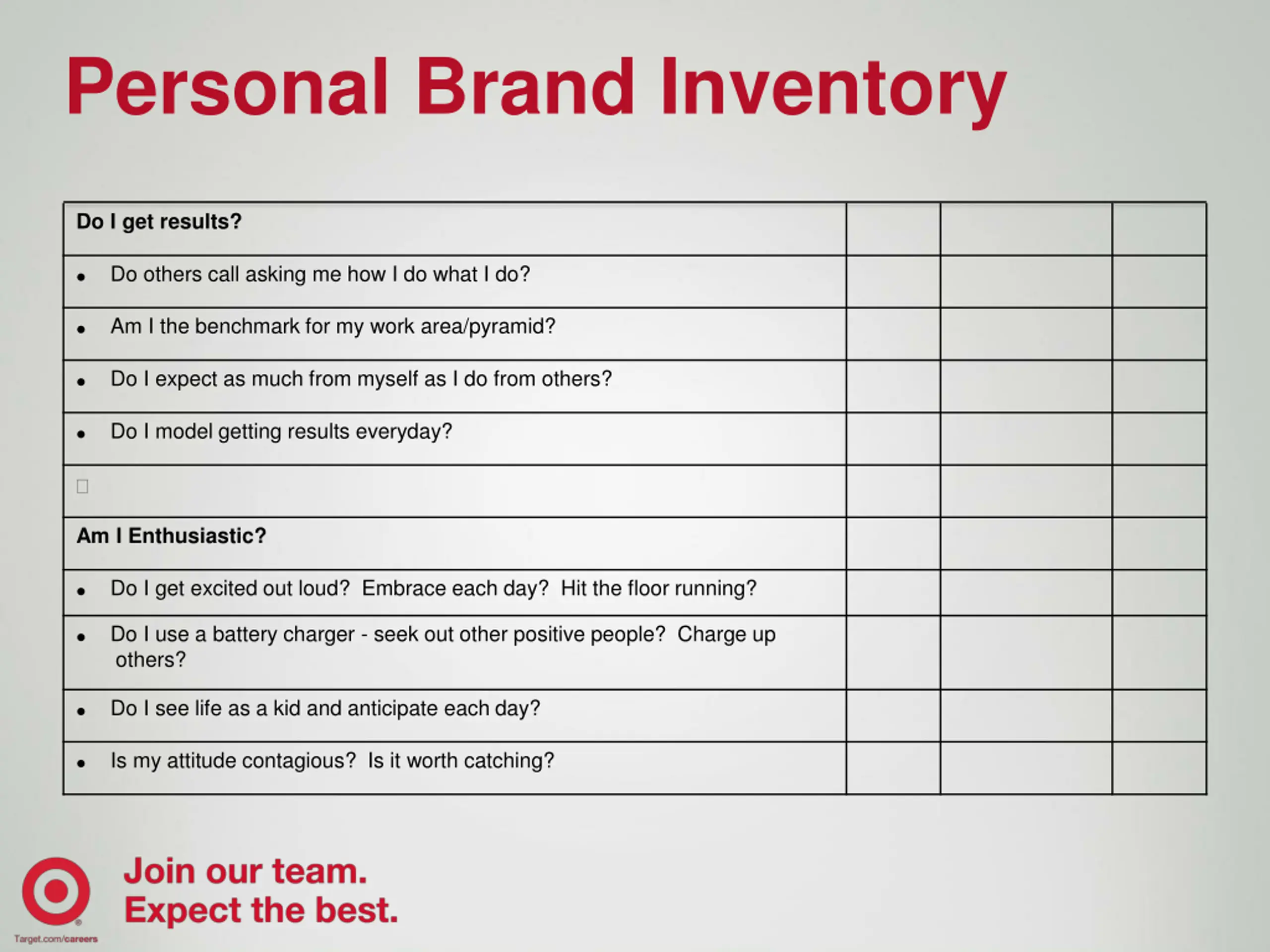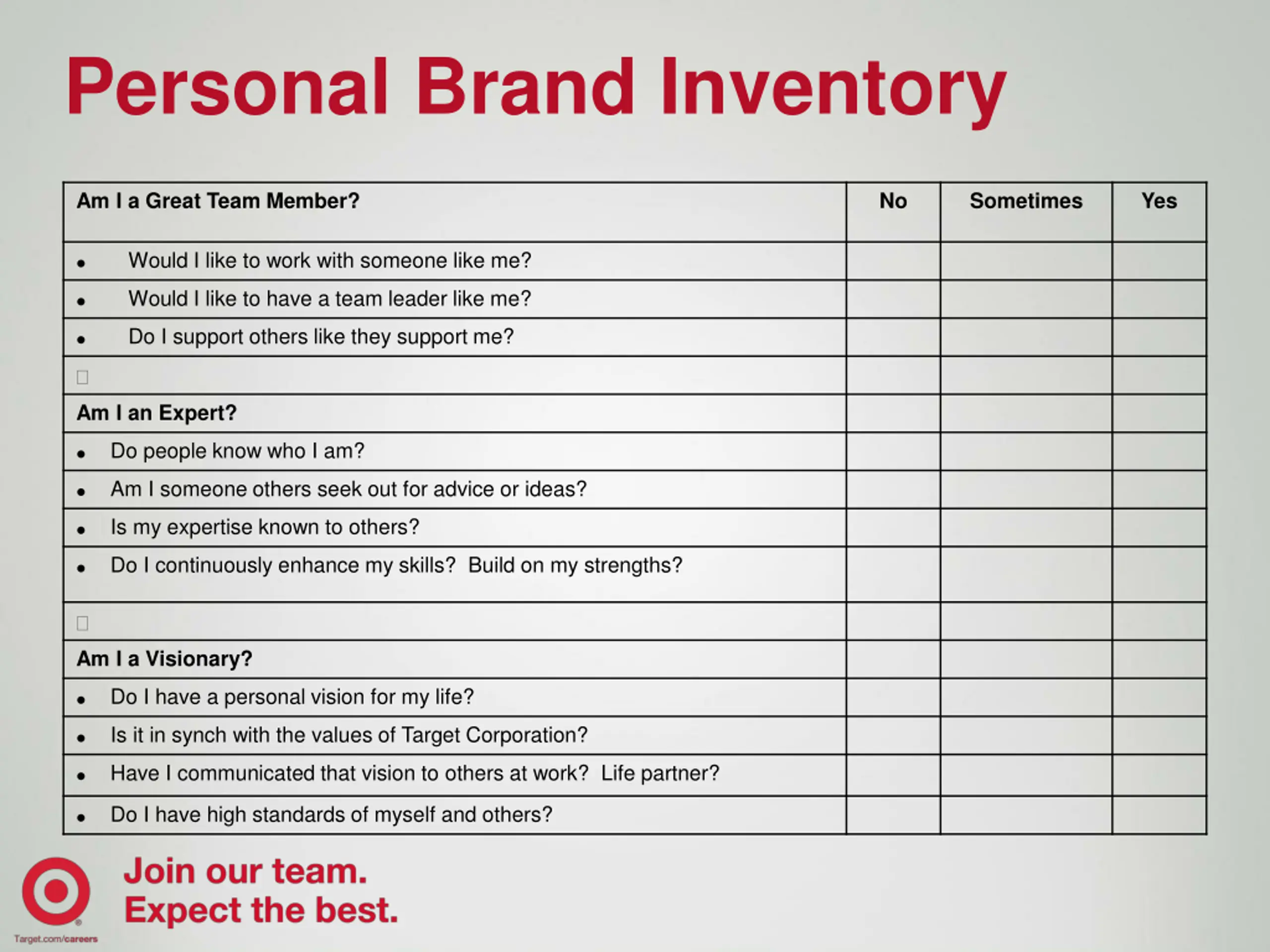 Personal Brand Inventory Am I a Great Team Member? No Sometimes Yes Would I like to work with someone like me? Would I like to have a team leader like me? Do I support others like they support me? Am I an Expert? Do people know who I am? Am I someone others seek out for advice or ideas? Is my expertise known to others? Do I continuously enhance my skills? Build on my strengths? Am I a Visionary? Do I have a personal vision for my life? Is it in synch with the values of Target Corporation? Have I communicated that vision to others at work? Life partner? Do I have high standards of myself and others?