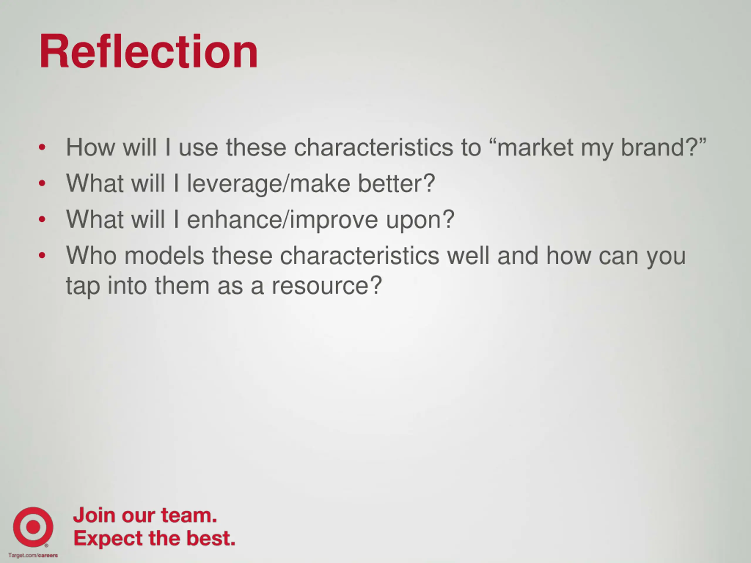 Reflection How will I use these characteristics to market my brand? What will I leverage/make better? What will I enhance/improve upon? Who models these characteristics well and how can you tap into them as a resource?